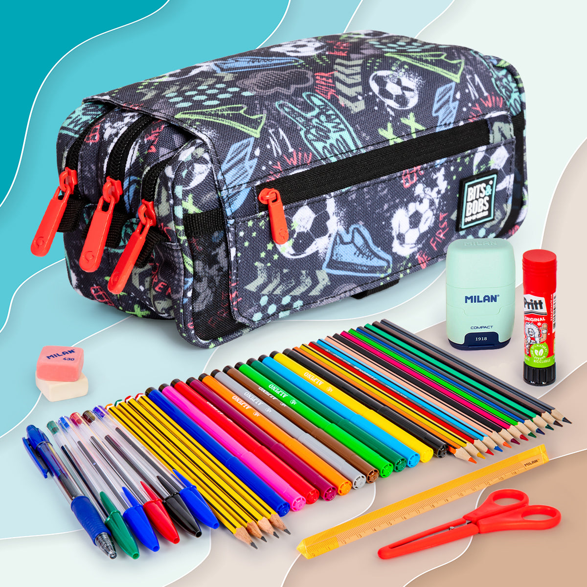 Estuche portatodo triple Grafoplás Bits and Bobs Design de amplios apartados y gran capacidad en formato rectangular. Cuenta con 3 cremalleras principales y una solapa exterior con tirador de tela y cierre de velcro. Además, cuenta con una tira trasera para poder colgarlo y con espacio para poder escribir tus datos personales.