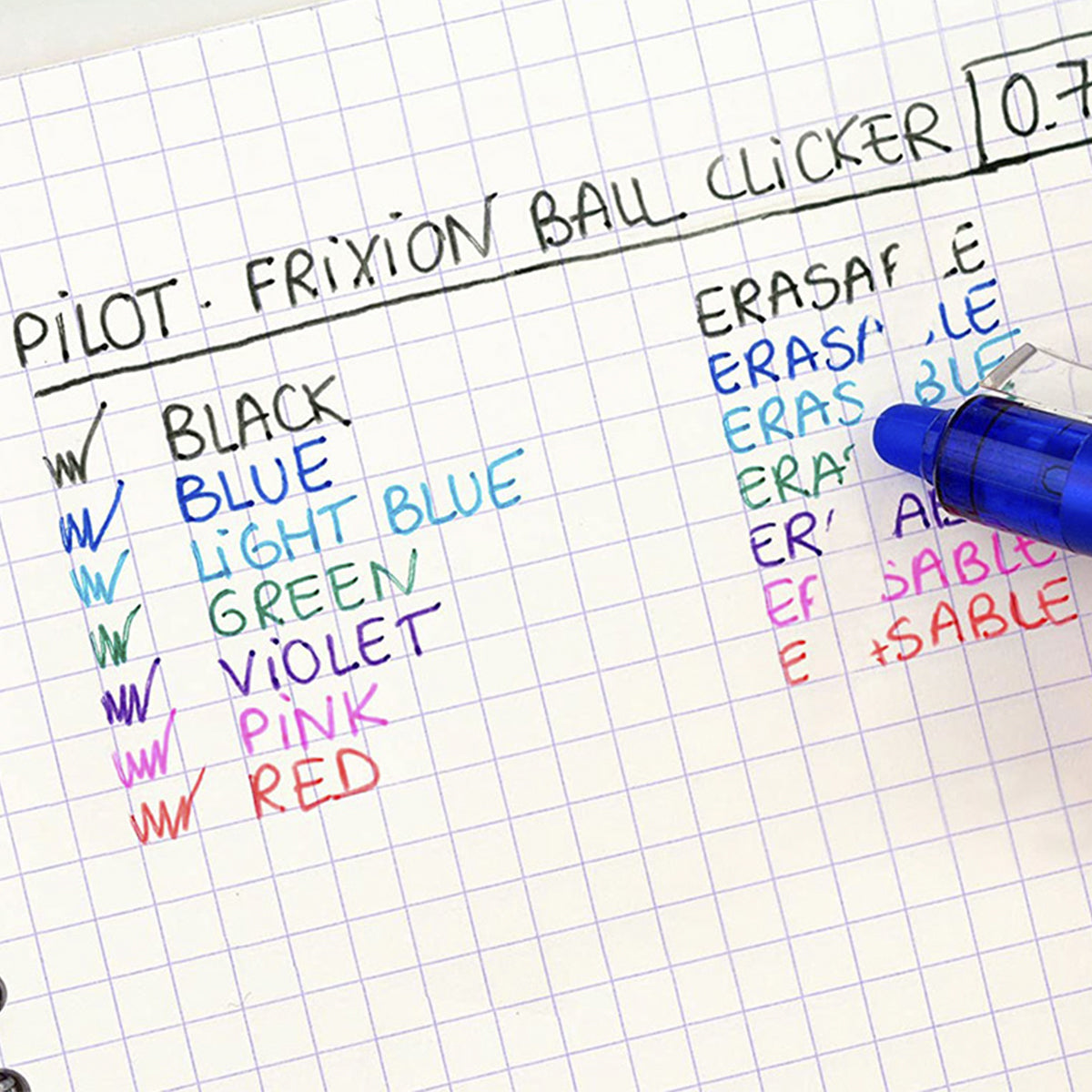 Bolígrafo retráctil, borrable y recargable Pilot FriXion Ball Clicker, con punta de bola de 0.7 mm y grip anti fatiga ergonómico en la parte inferior. Tinta líquida especial (Recargable) termosensible que se corrige con su exclusiva goma de borrar. El color del cuerpo del bolígrafo coincide con el color de la tinta.