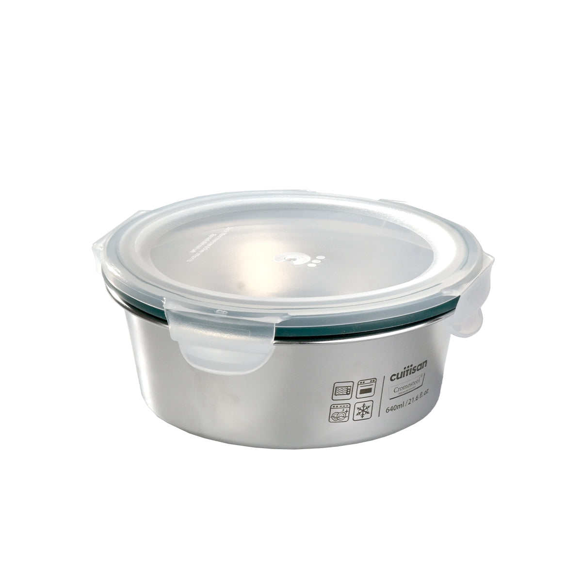 Recipiente hermético redondo de 0.6L Cuitisan Simple fabricado en Cromosteel, un acero inoxidable 18/12 con aleación de cromo y cobre, especialmente resistente a la oxidación y las bacterias, apto para microondas.