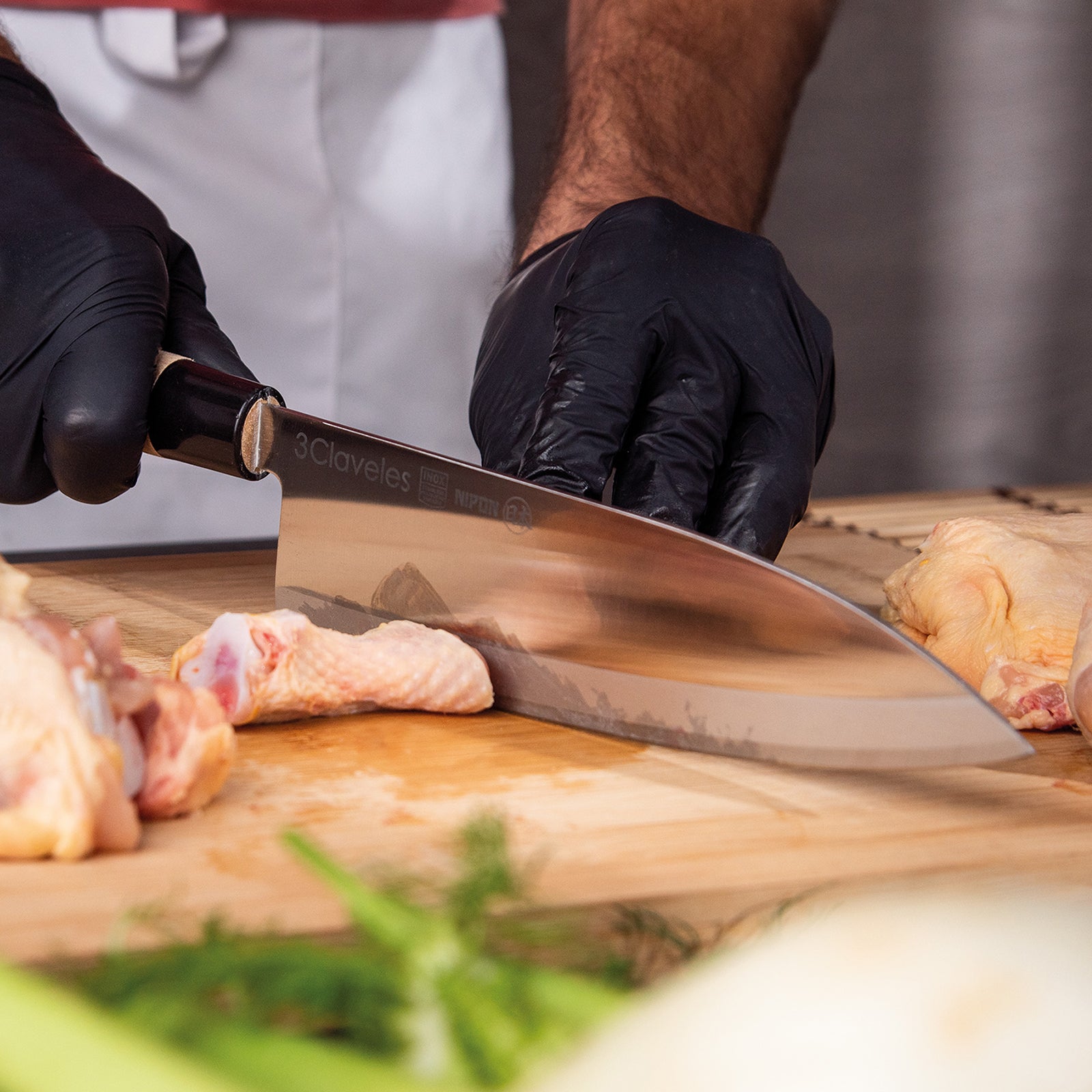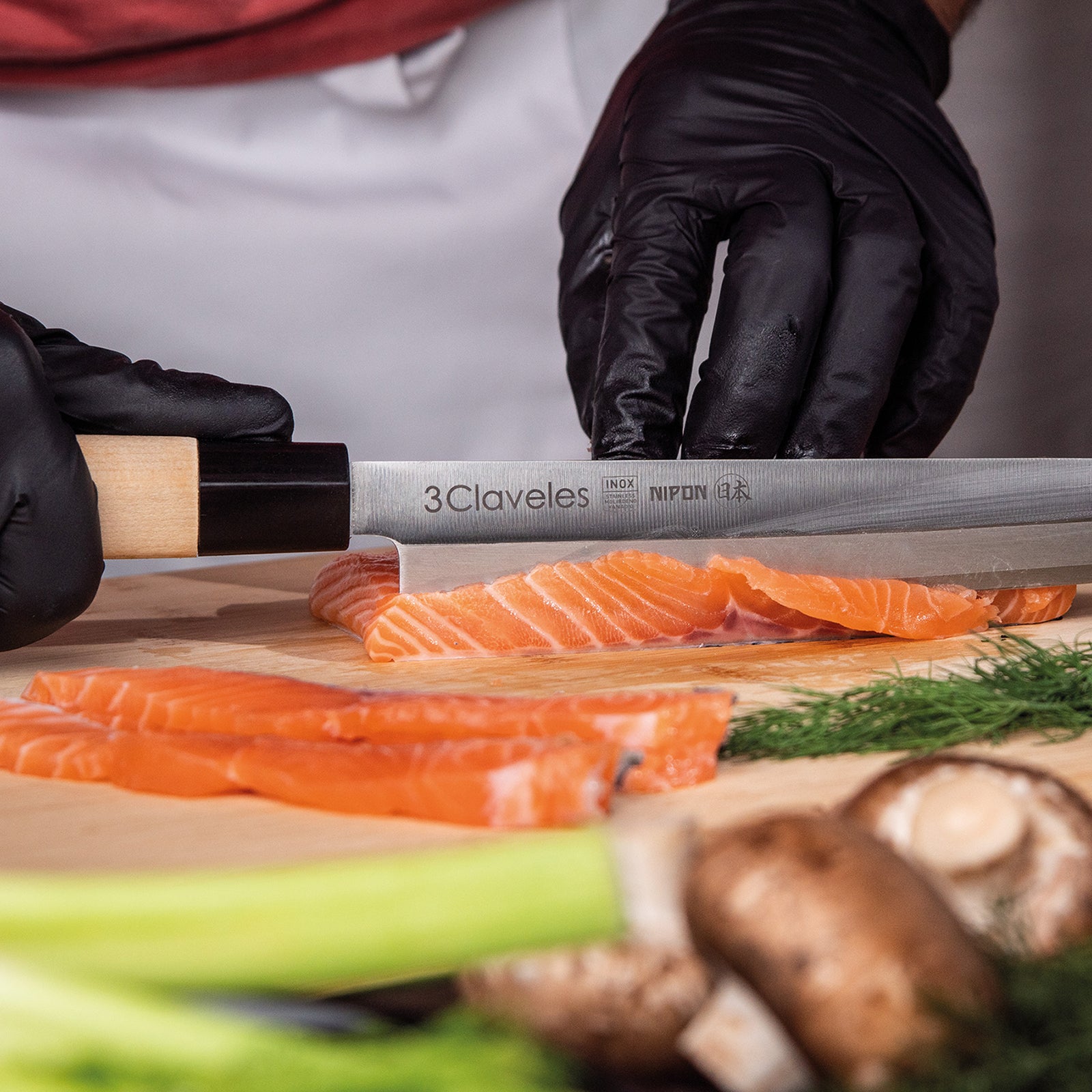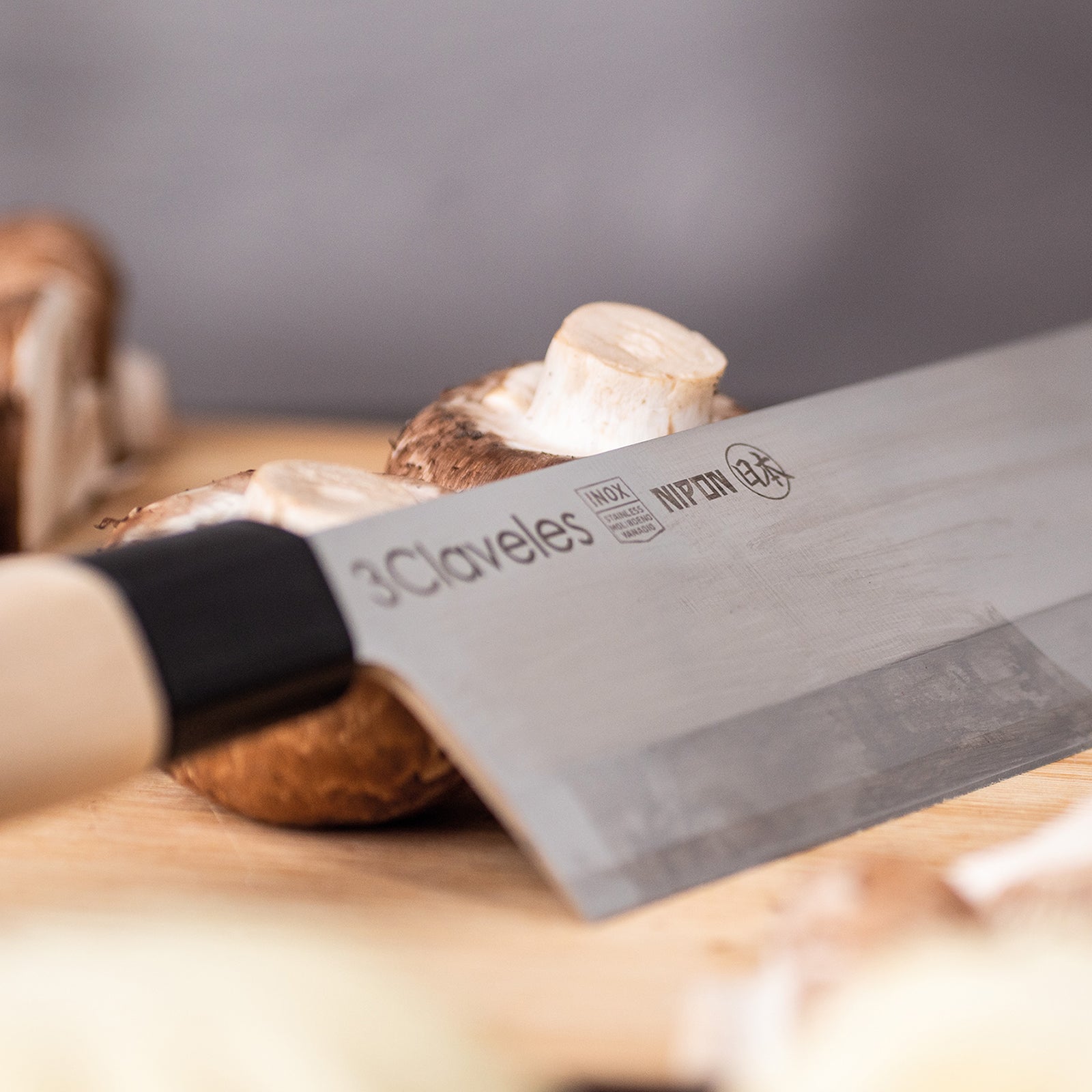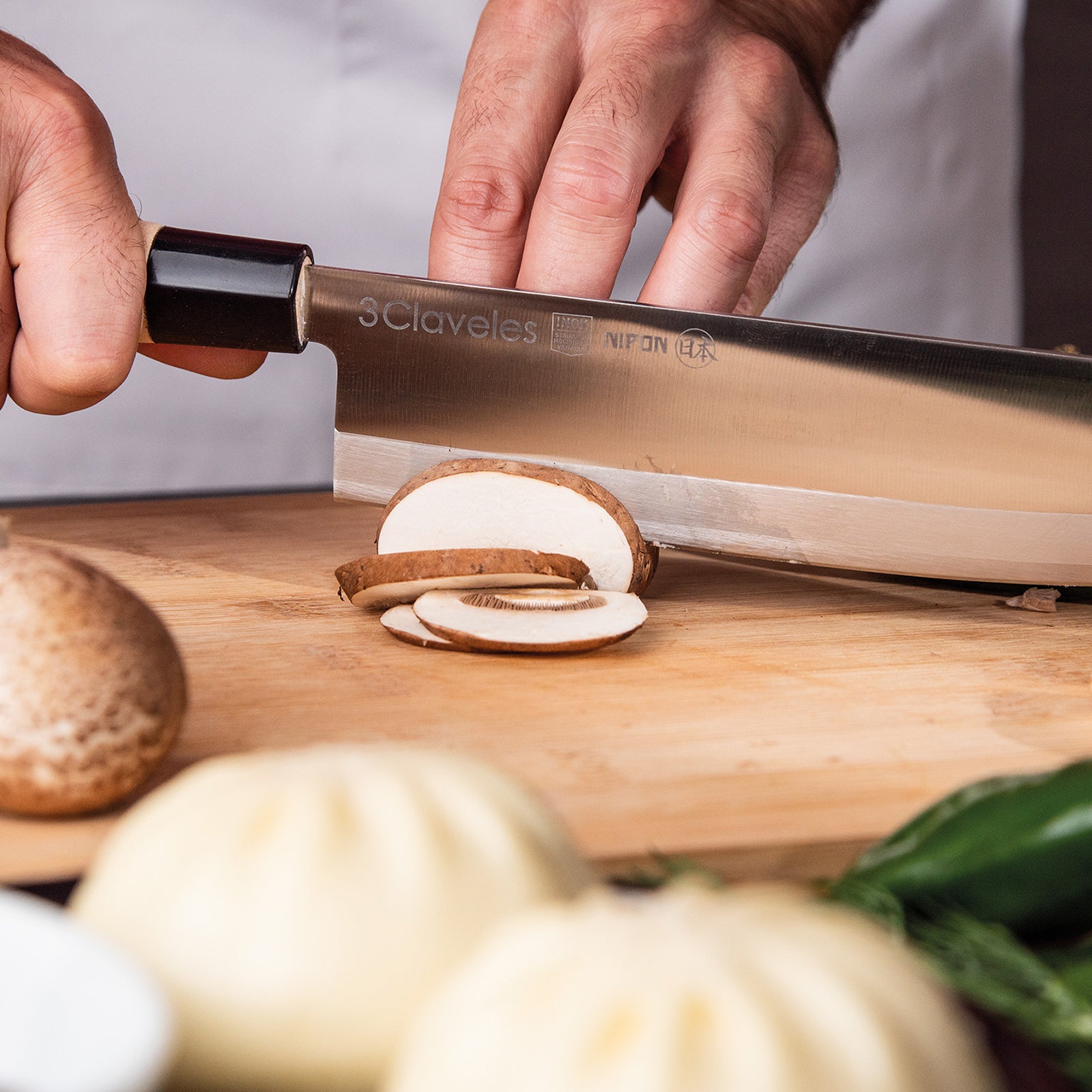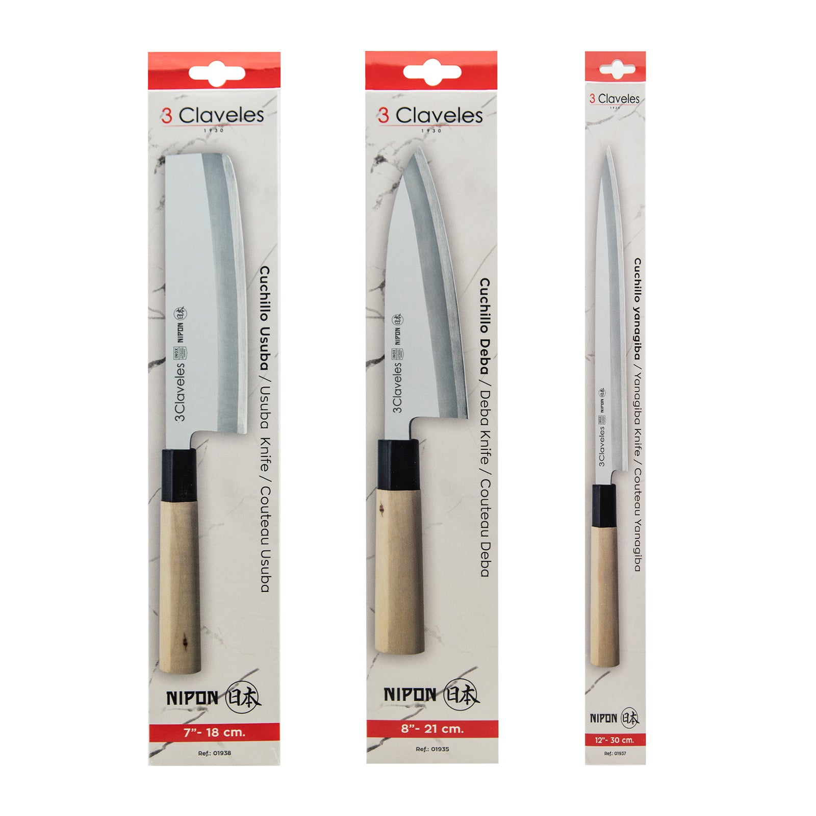 Juego de 3 cuchillos profesionales de la gama 3 Claveles NIPON de estilo japonés, donde predominan las líneas rectas en la forma del mango, pensado para el uso diario sin renunciar al diseño. Especiales para realizar cortes precisos y profundos por el filo en un solo lado al estilo tradicional de la cocina asiatica.