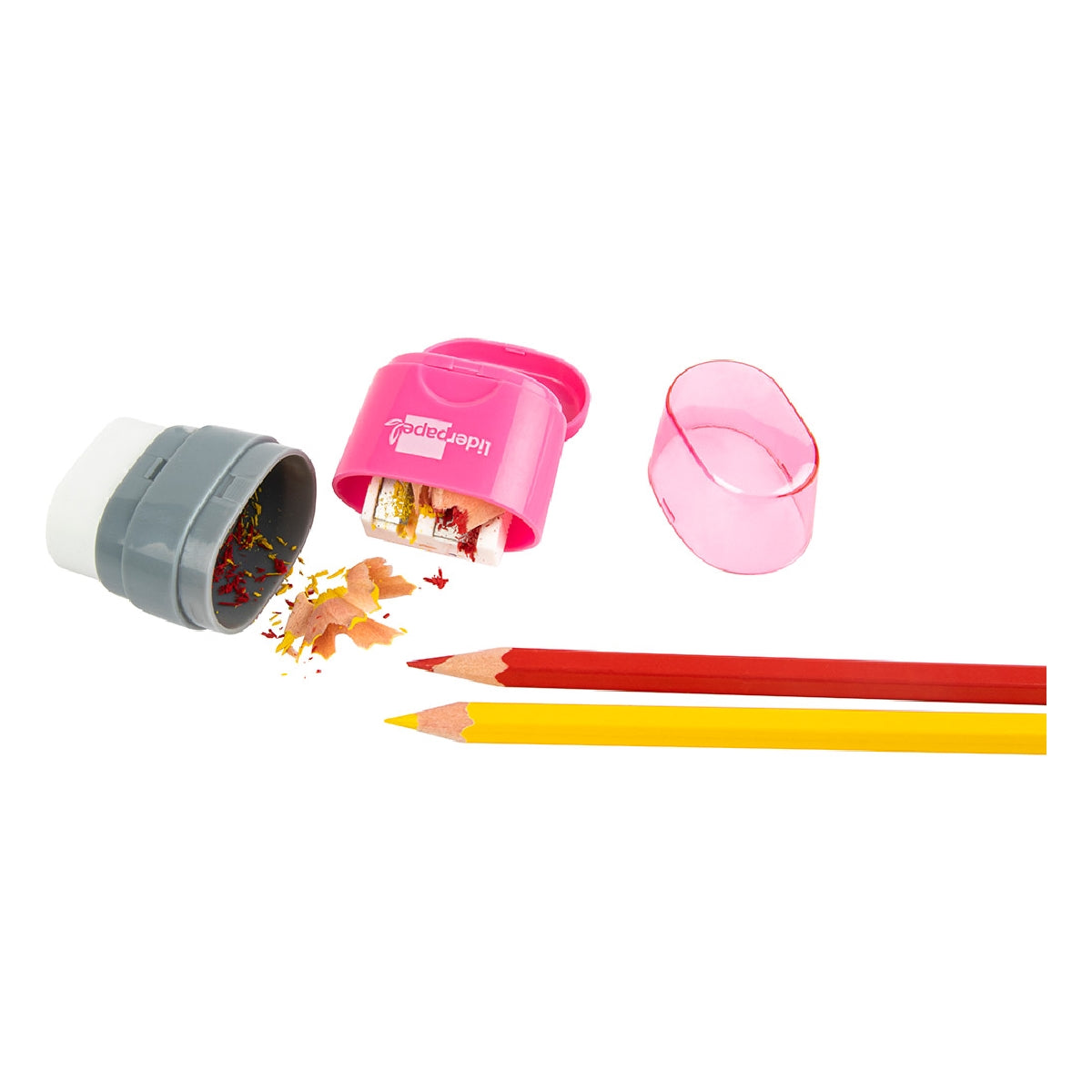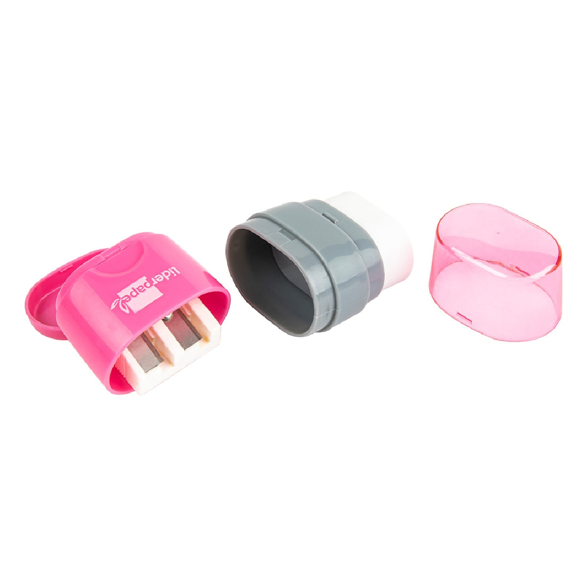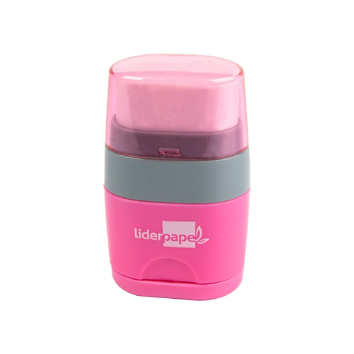 Sacapuntas con goma. Con depósito. Sin PVC. Longitud: 61 mm. Ancho: 34 mm. Grosor: 23 mm. Colores surtidos. Dos usos.