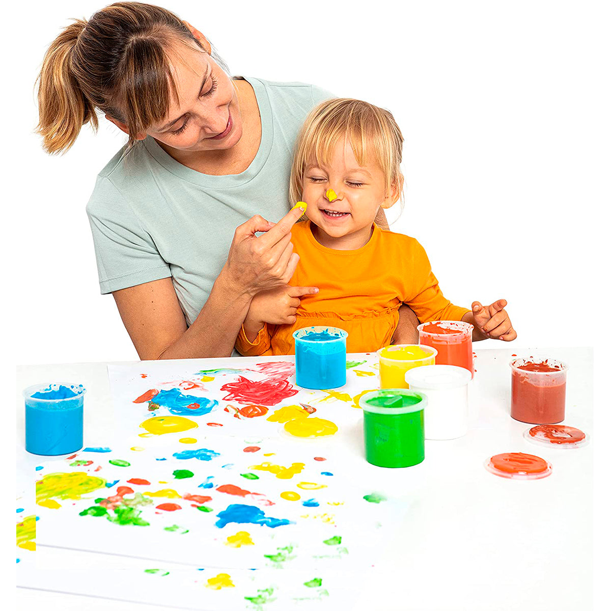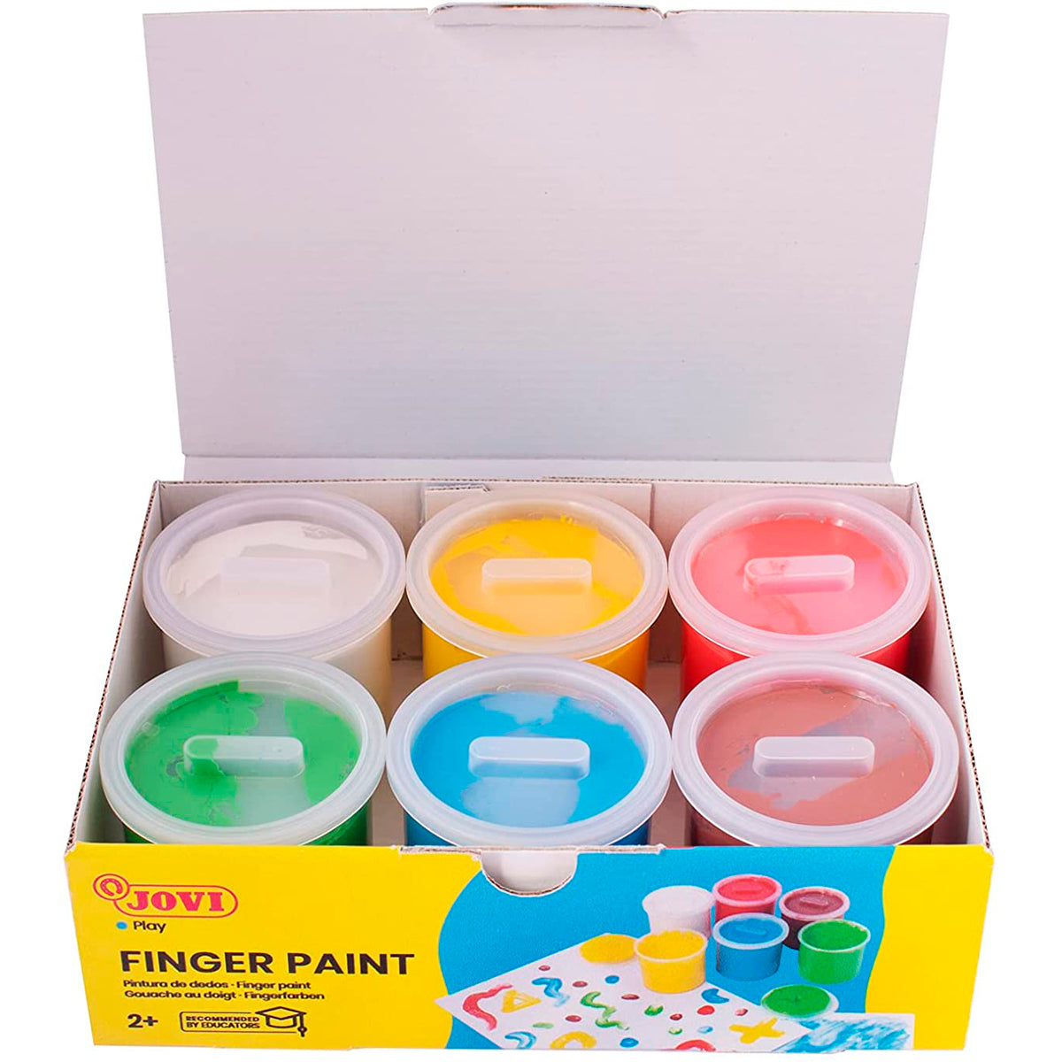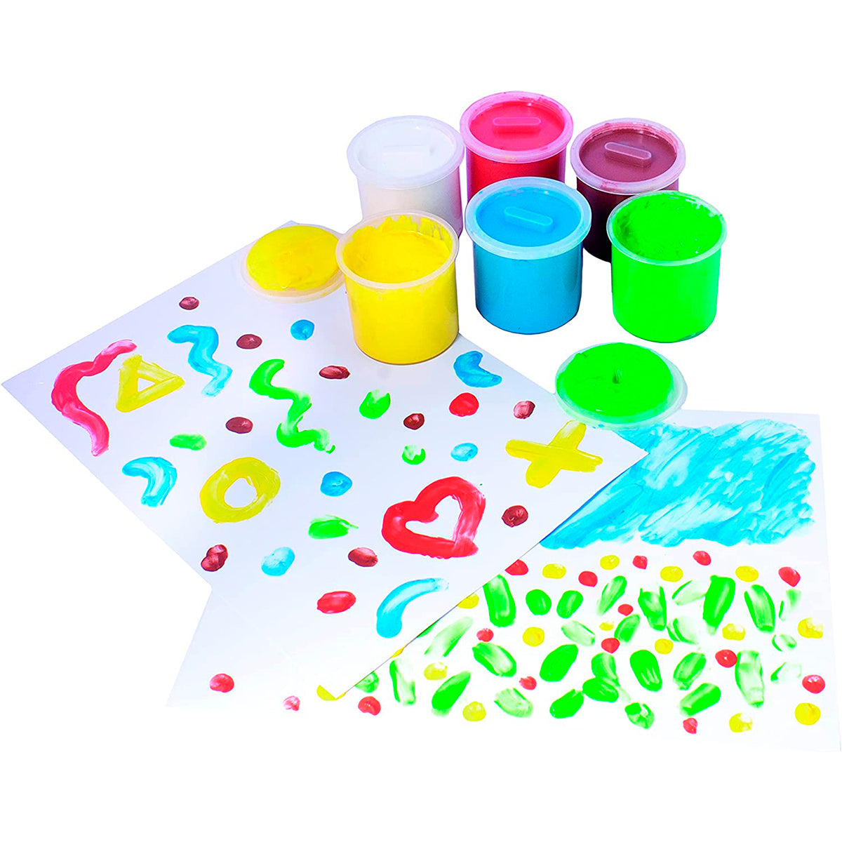 Caja con 6 botes de pintura a dedos, cada bote contiene 125ml de pintura de colores brillante, segura para los más pequeños de la casa dermatológicamente testada, no es tóxica y es libre de gluten.
