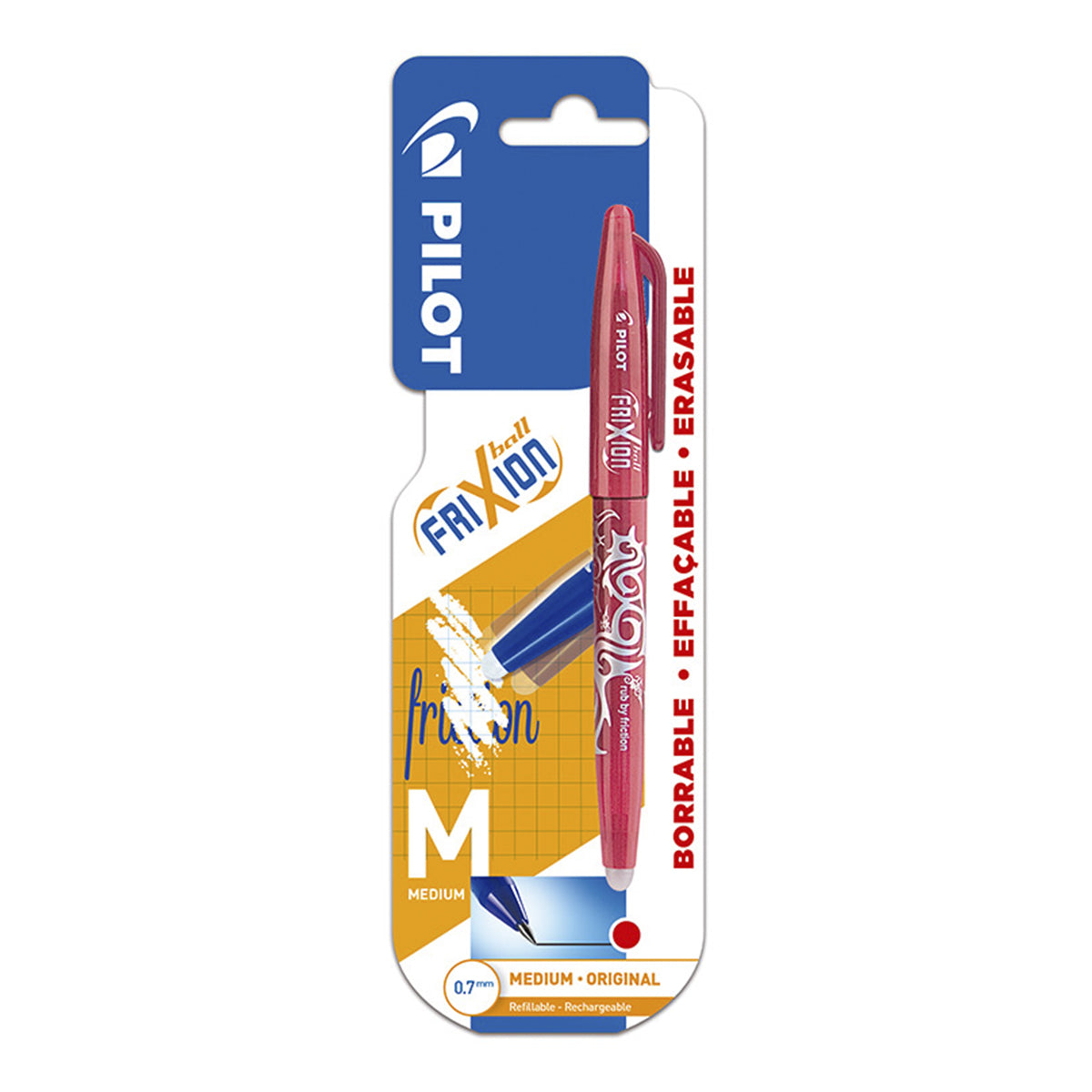 Set de 3 bolígrafos retráctiles Pilot FriXion Ball, borrables y recargables, con punta de bola de 0.7 mm y grip anti fatiga. Tinta líquida especial (Recargable) termosensible que se corrige con su exclusiva goma de borrar. El color del cuerpo del bolígrafo coincide con el color de la tinta. Versión con tapón para proteger la punta.