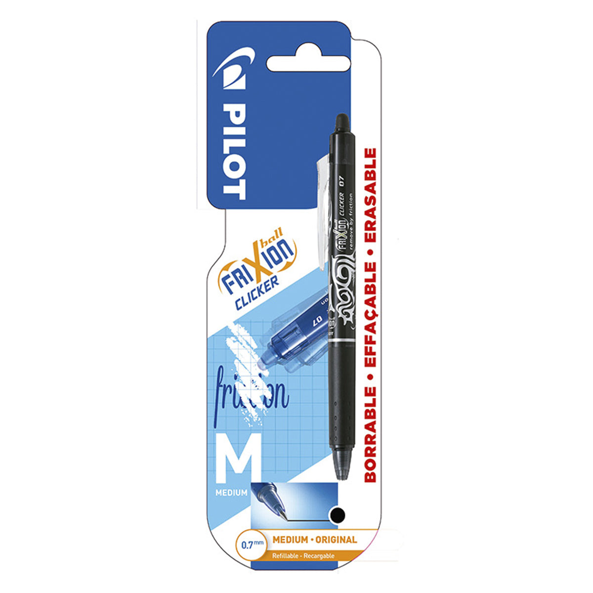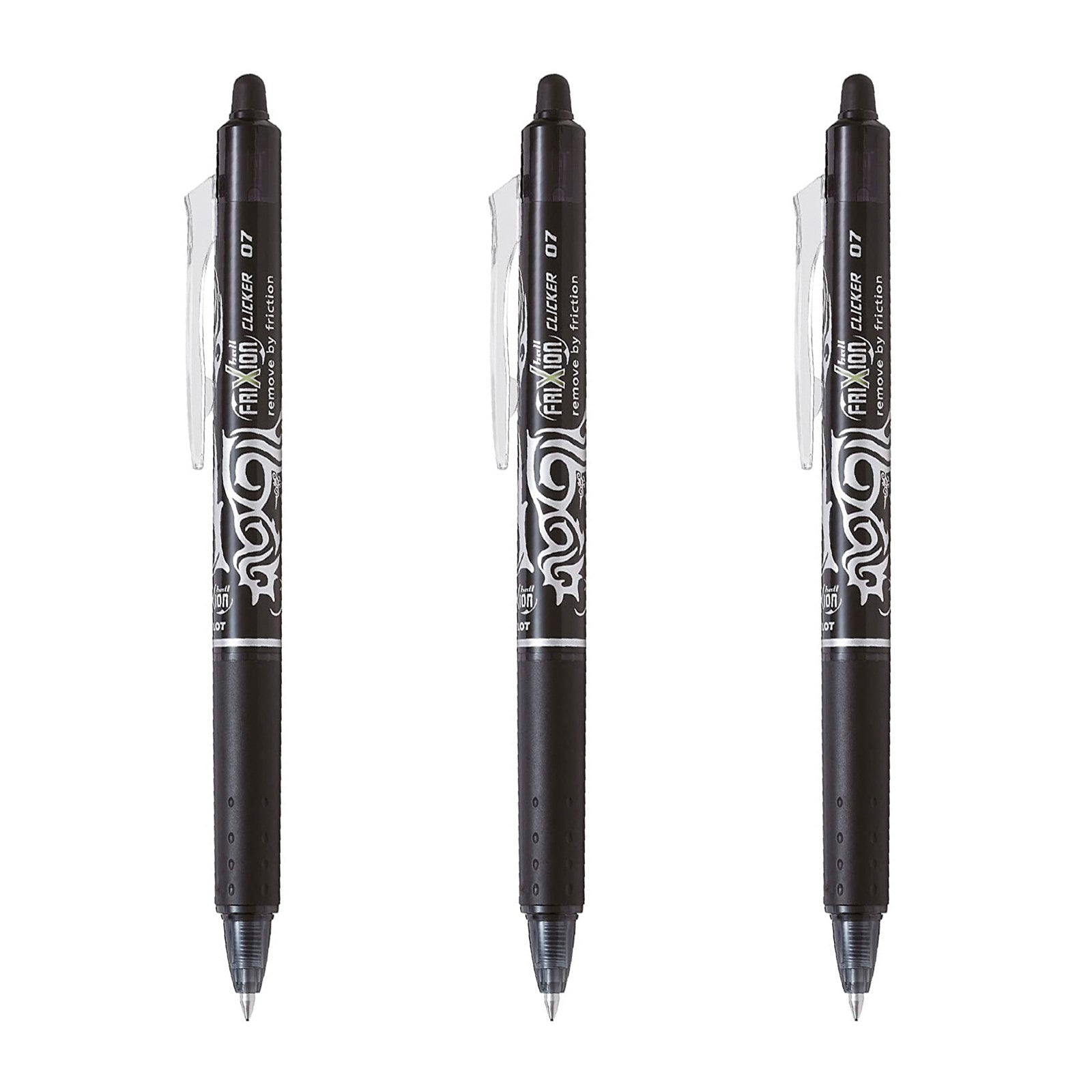Set de 3 bolígrafos retráctiles Pilot FriXion Ball Clicker, borrables y recargables, con punta de bola de 0.7 mm y grip anti fatiga. Es ergonómico en la parte inferior. Tinta líquida especial (Recargable) termosensible que se corrige con su exclusiva goma de borrar. El color del cuerpo del bolígrafo coincide con el color de la tinta.