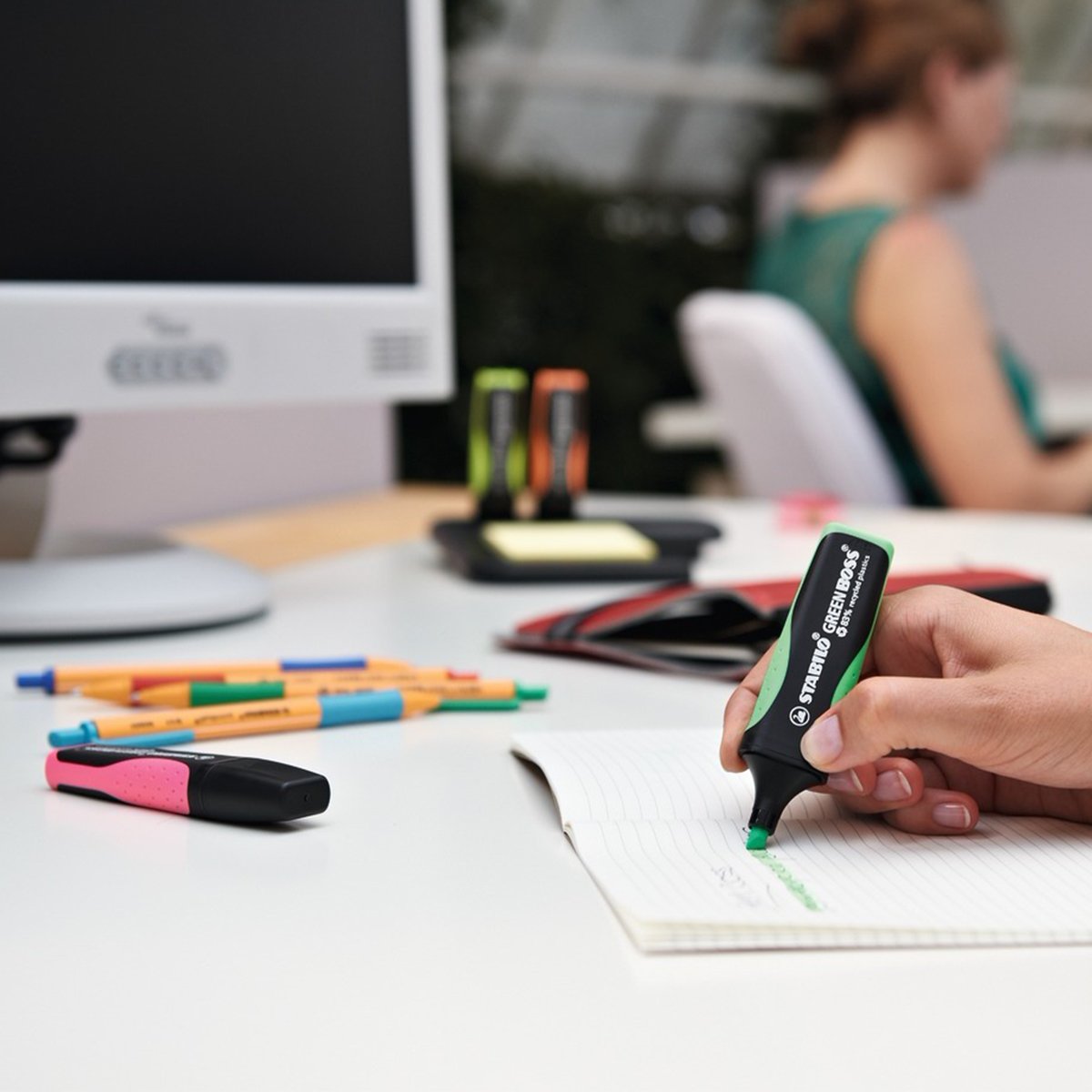 Estos fluorescentes STABILO combinan la alta calidad con la sostenibilidad y es la elección perfecta para quienes tienen consciencia ecológica. Hecho con un 83% de plástico reciclado para conservar los recursos naturales y reducir los desechos. Es además recargable, compatible con las recargas del STABILO BOSS ORIGINAL.