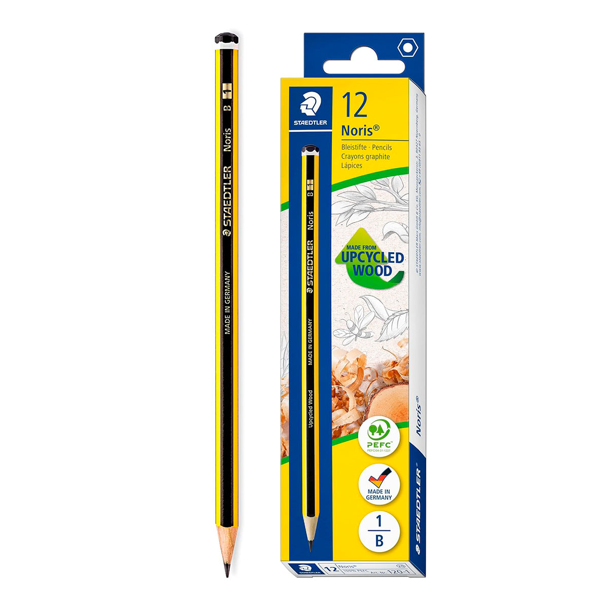 Caja de 12 lápices hexagonales de grafito de alta calidad para escribir, dibujar y esbozar. Dureza 1B, increíblemente resistente a la rotura gracias a la fórmula especial de la mina y a la encoladura. Madera certificada, procedente de bosques de gestión sostenible.