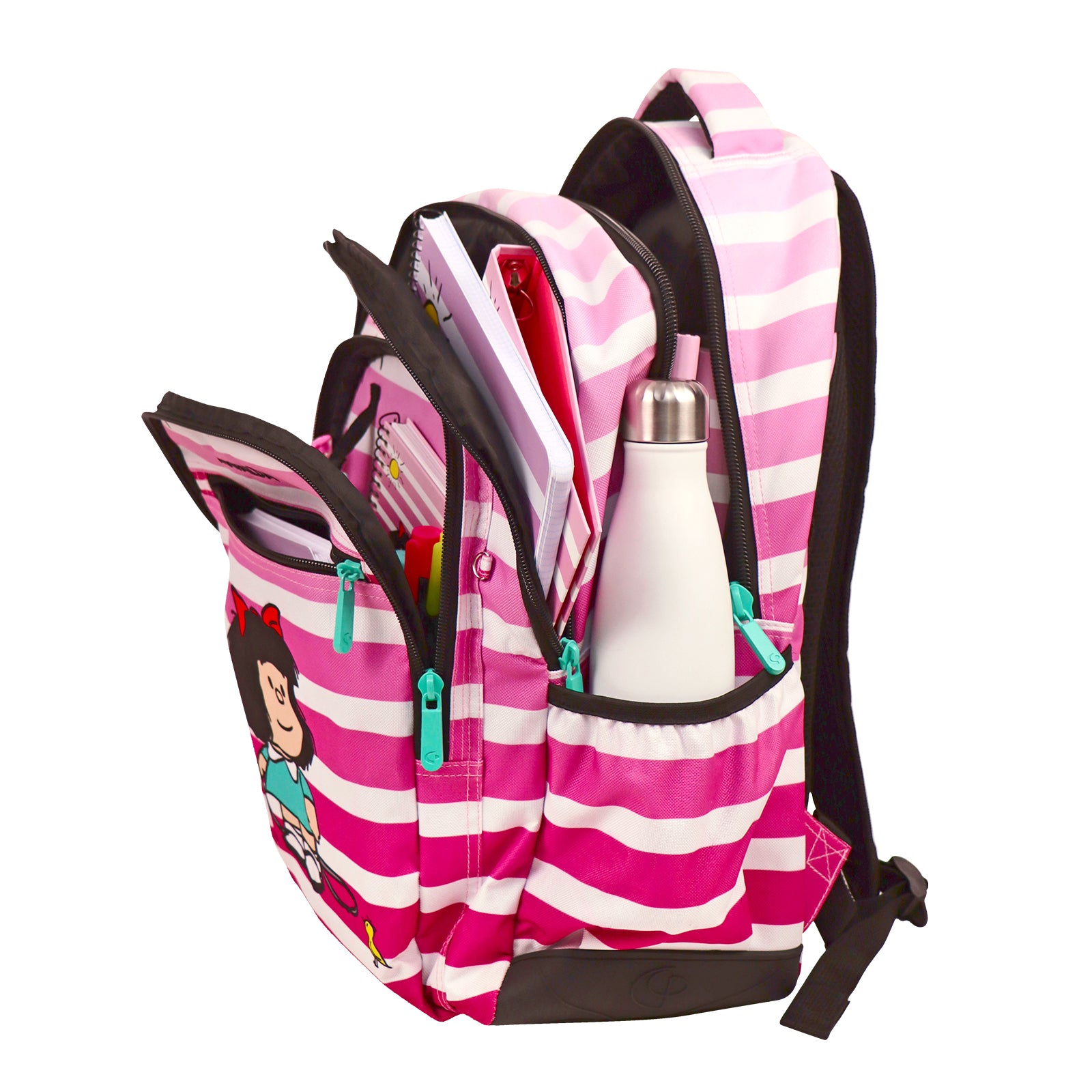 Además de los tres apartados principales, cuenta con un bolsillo frontal y dos bolsillos laterales con goma elástica. En el interior del compartimento frontal, dispone de una anilla para poder colgar las llaves y tenerlas siempre a mano, 3 espacios para bolígrafos y un bolsillo de malla pequeño con cierre de cremallera.