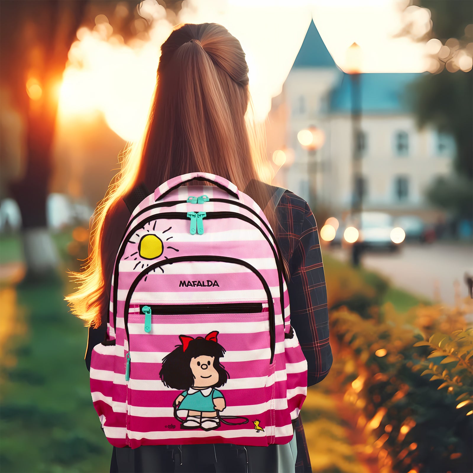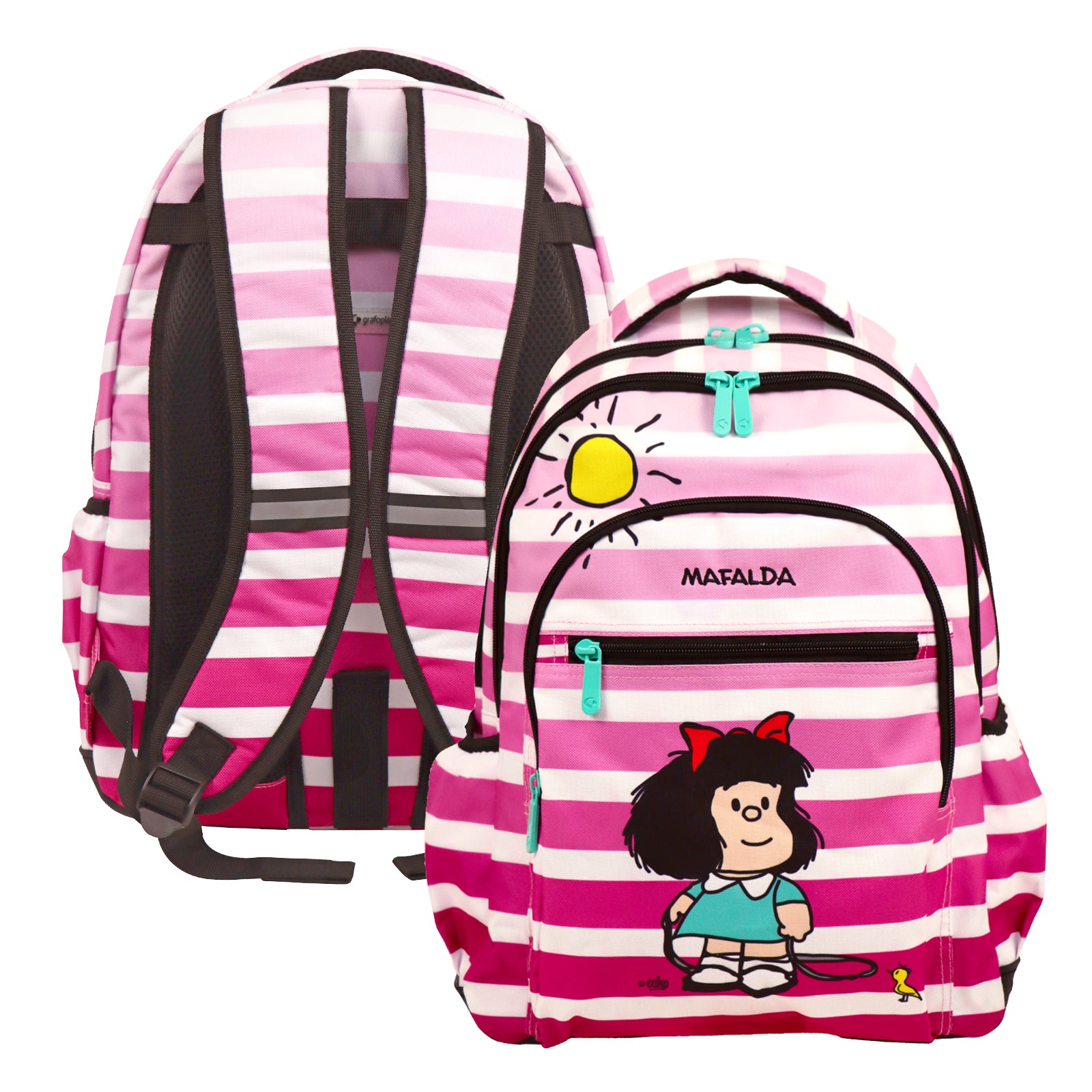 Asa de mano superior con agarre reforzado y acolchado. Los tirantes traseros son regulables y acolchados, con tiras reflectantes. La parte posterior acolchada y transpirable y base reforzada para dar forma a la mochila. Fabricada en 100% poliéster. Lavar a mano a máximo 20ºC.