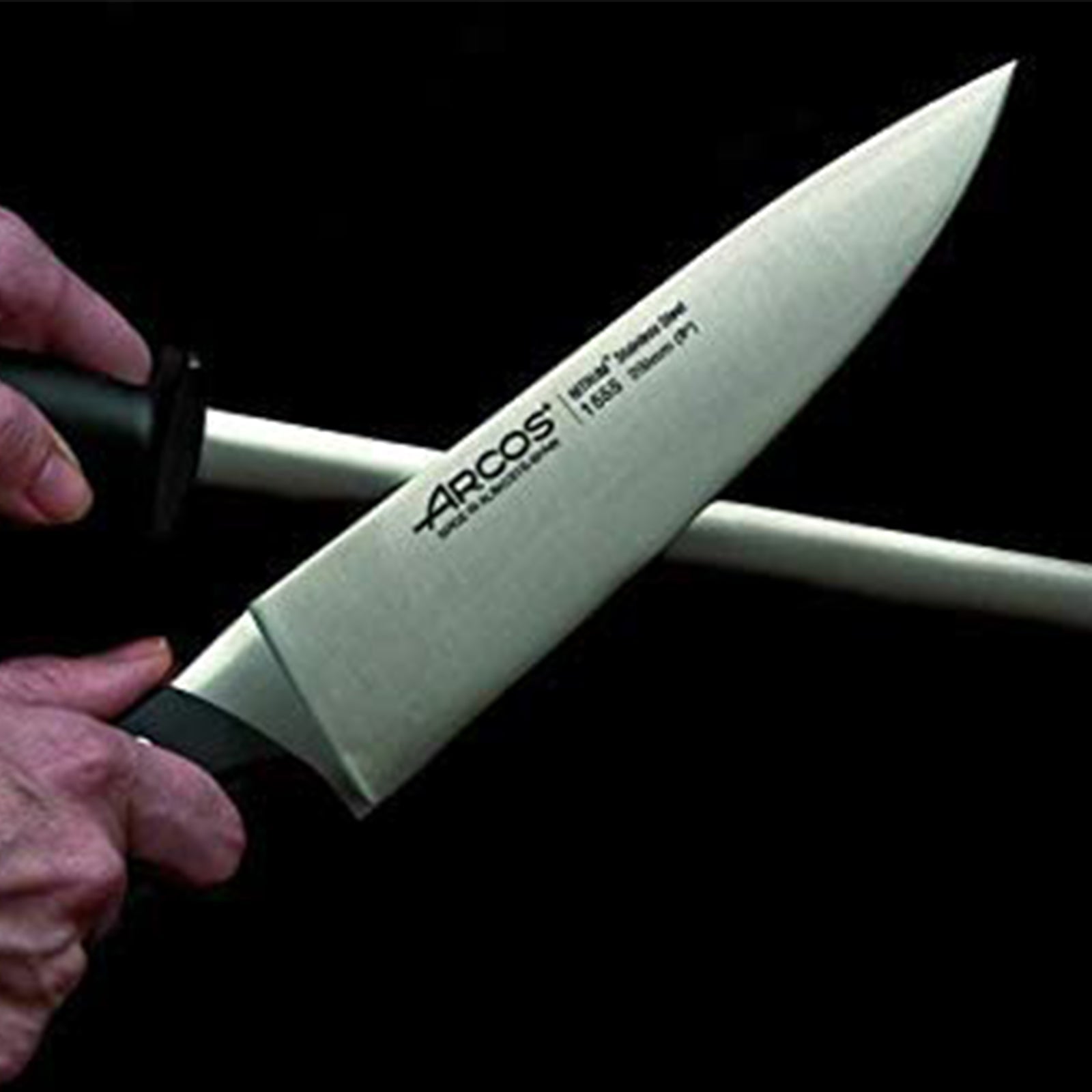 Cuerpo: Los cuchillos sufren un fuerte desgaste debido al uso cotidiano. La utilización de la chaira garantiza un mantenimiento del filo impecable debido al acero rico en carbono cromado para su cuerpo