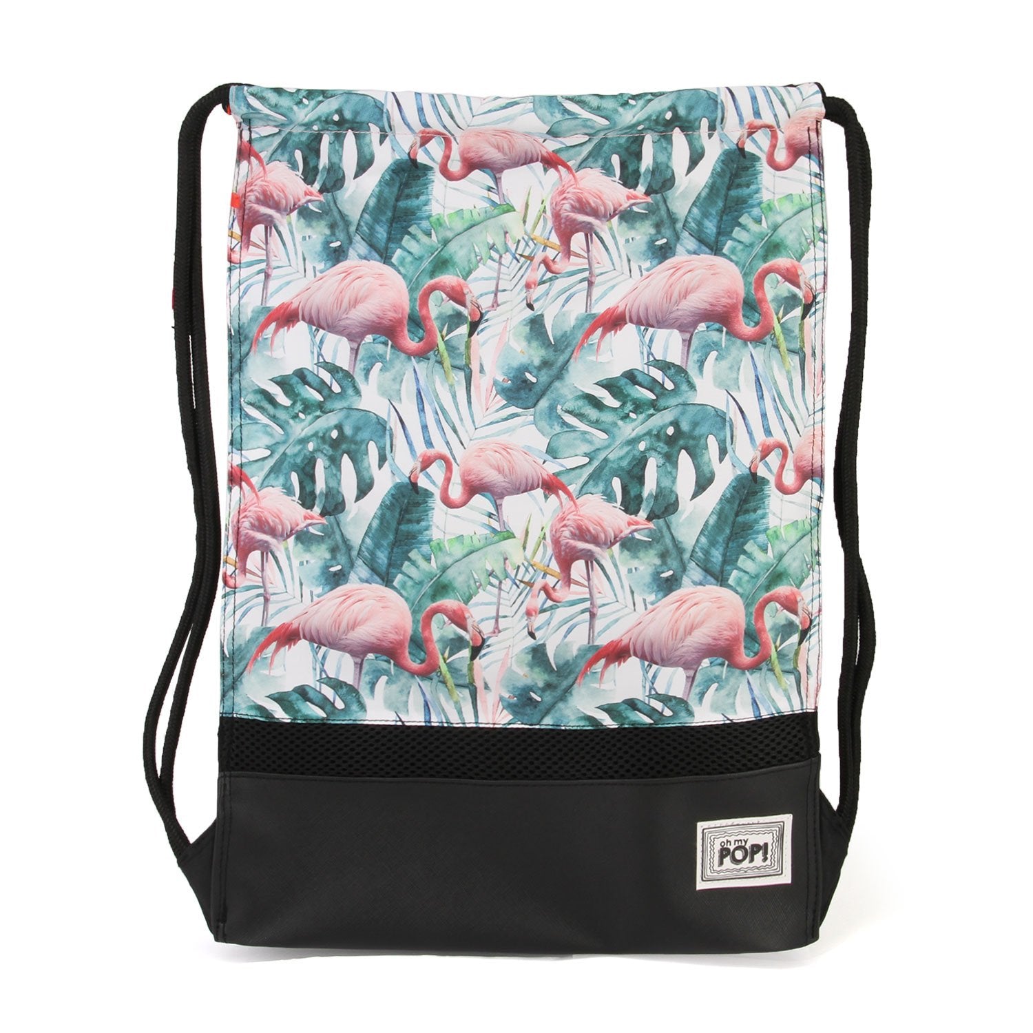 Mochila en formato saco de cuerdas con diseño deportivo. Compartimento único de gran capacidad. Base reforzada con cuero PU y banda horizontal de tejido transpirable.
