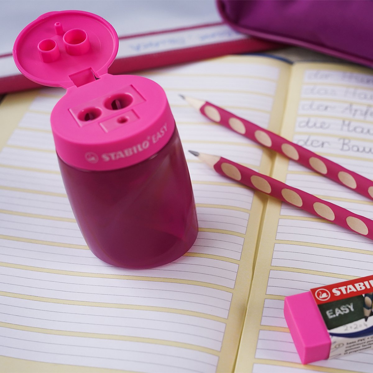 Incluye goma de borrar libre de PVC y de sacapuntas EASYSharpener, ideal para los EASYcolors, los lápices EASYgraph y EASYergo, y para todos los lápices de madera estándar. Tiene un diseño ergonómico que se adapta perfectamente a la mano de los niños. Disponible para diestros y zurdos y puede usarte en 3 diámetros de punta distintos. Diseñado para niños en edad pre-escolar y escolar a partir de 5 años, totalmente seguro para prevenir las posibles heridas de los niños. Cierre de tapa y espacio para el nombre.