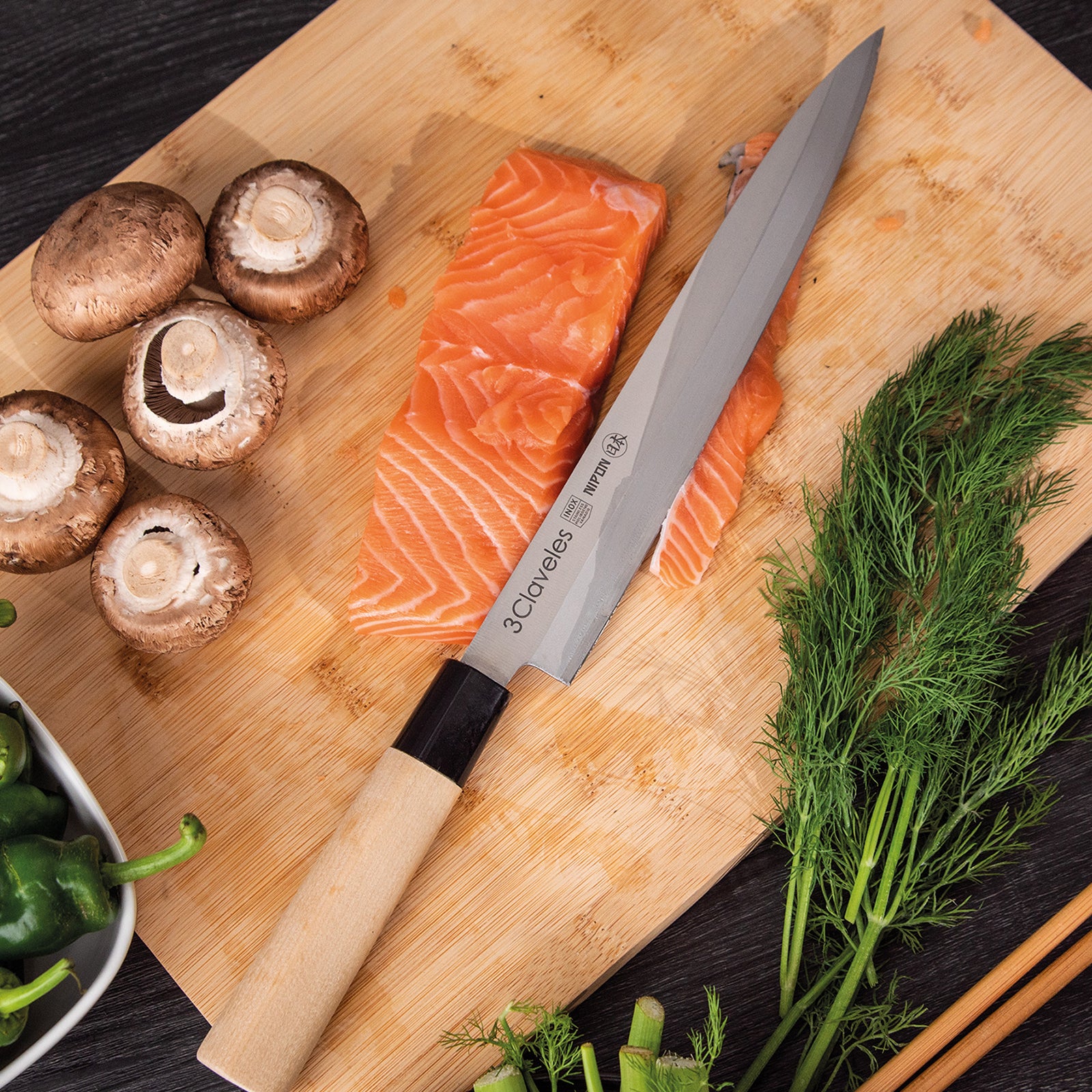 Cuchillo profesional Yanagiba de 240 mm de la gama 3 Claveles NIPON de estilo japonés, donde predominan las líneas rectas en la forma del mango, pensado para el uso diario sin renunciar al diseño. Diseñado para cortar al tamaño deseado y filetear pescado o carne en el movimiento de vuelta. Hoja delgada en forma de sauce o Katana. Es el cuchillo que se utiliza tal y como su nombre indica para cortar sashimi y también para sushi. Especial para realizar cortes precisos y profundos por el filo en un solo lado al estilo tradicional de la cocina asiatica.