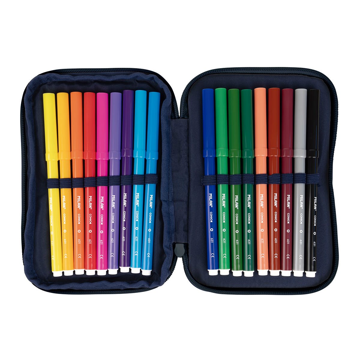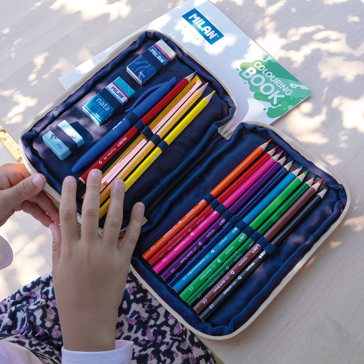 Plumier de 2 pisos Milan Colección 430 since 1918 de color azul, que permite mantener el material escolar siempre ordenado y de fácil acceso. Cremalleras reforzadas, estructura flexible y diseño inspirado en los colores originales de las gomas de borrar MILAN, fabricadas en España desde 1918.