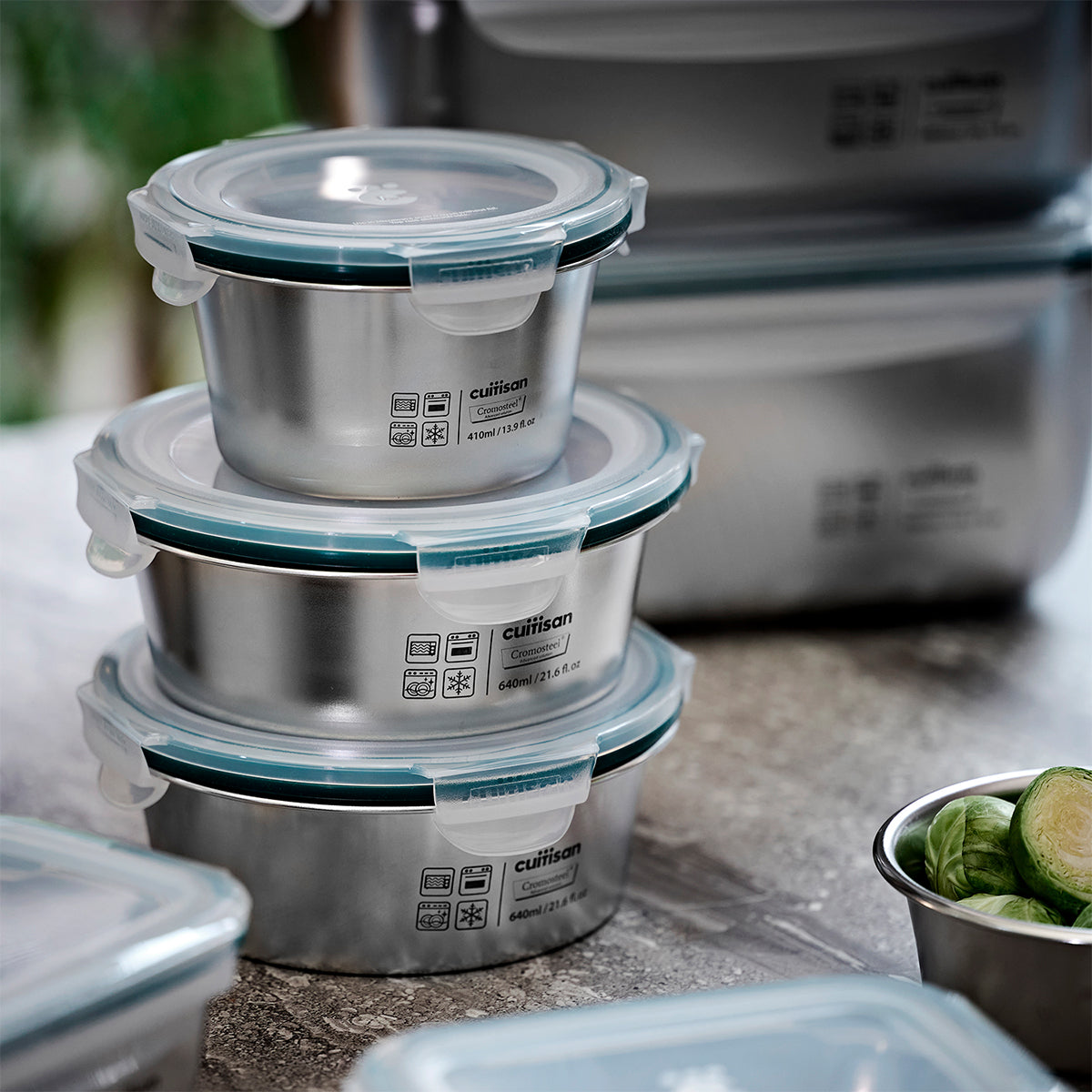 Lote de 4 recipientes herméticos redondos de 0.3L, 0.41L, 0.64L y 0.92L Cuitisan Simple fabricados en Cromosteel, un acero inoxidable 18/12 con aleación de cromo y cobre, especialmente resistente a la oxidación y las bacterias, apto para microondas.