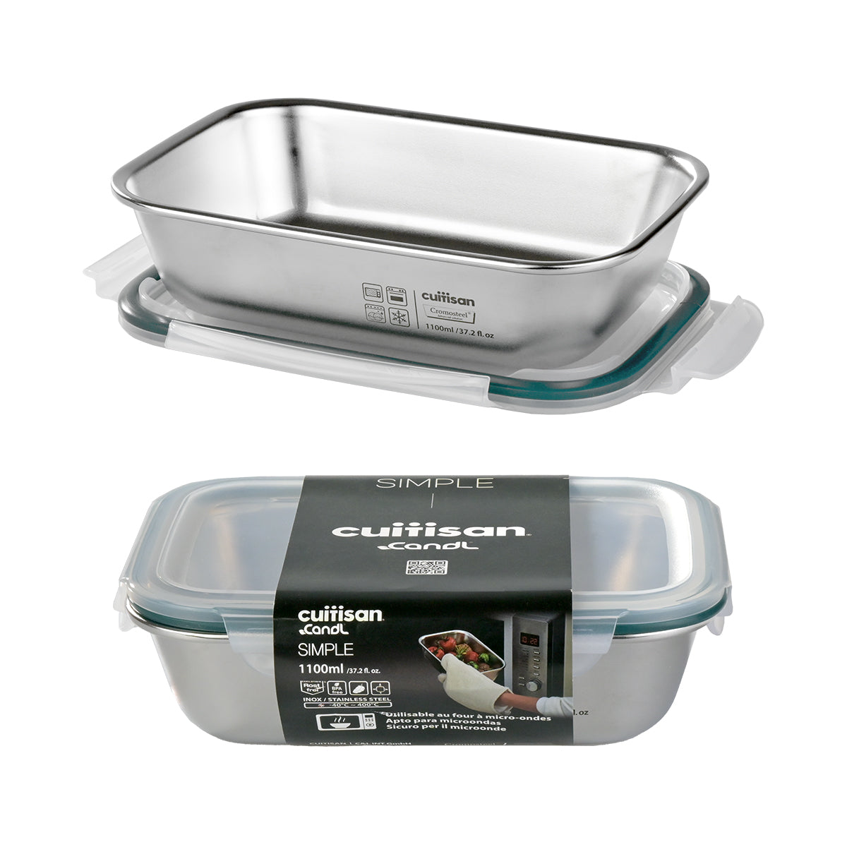 Recipiente hermético rectangular de 1.1L Cuitisan Simple fabricado en Cromosteel, un acero inoxidable 18/12 con aleación de cromo y cobre, especialmente resistente a la oxidación y las bacterias, apto para microondas.