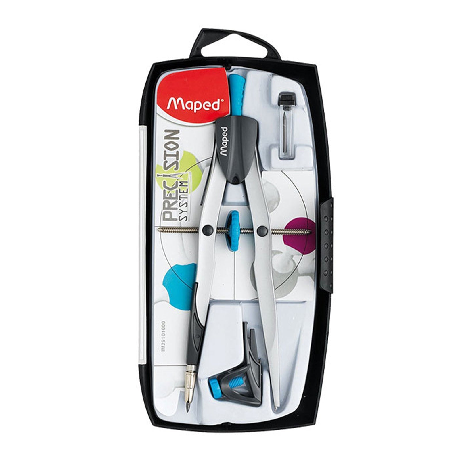 Compás tipo bigotera de alta precisión MAPED Precision System en estuche. Incluye una abrazadera universal y un estuche de minas. Sistema de apertura rápida y ajuste de precisión para favorecer una rigidez perfecta.