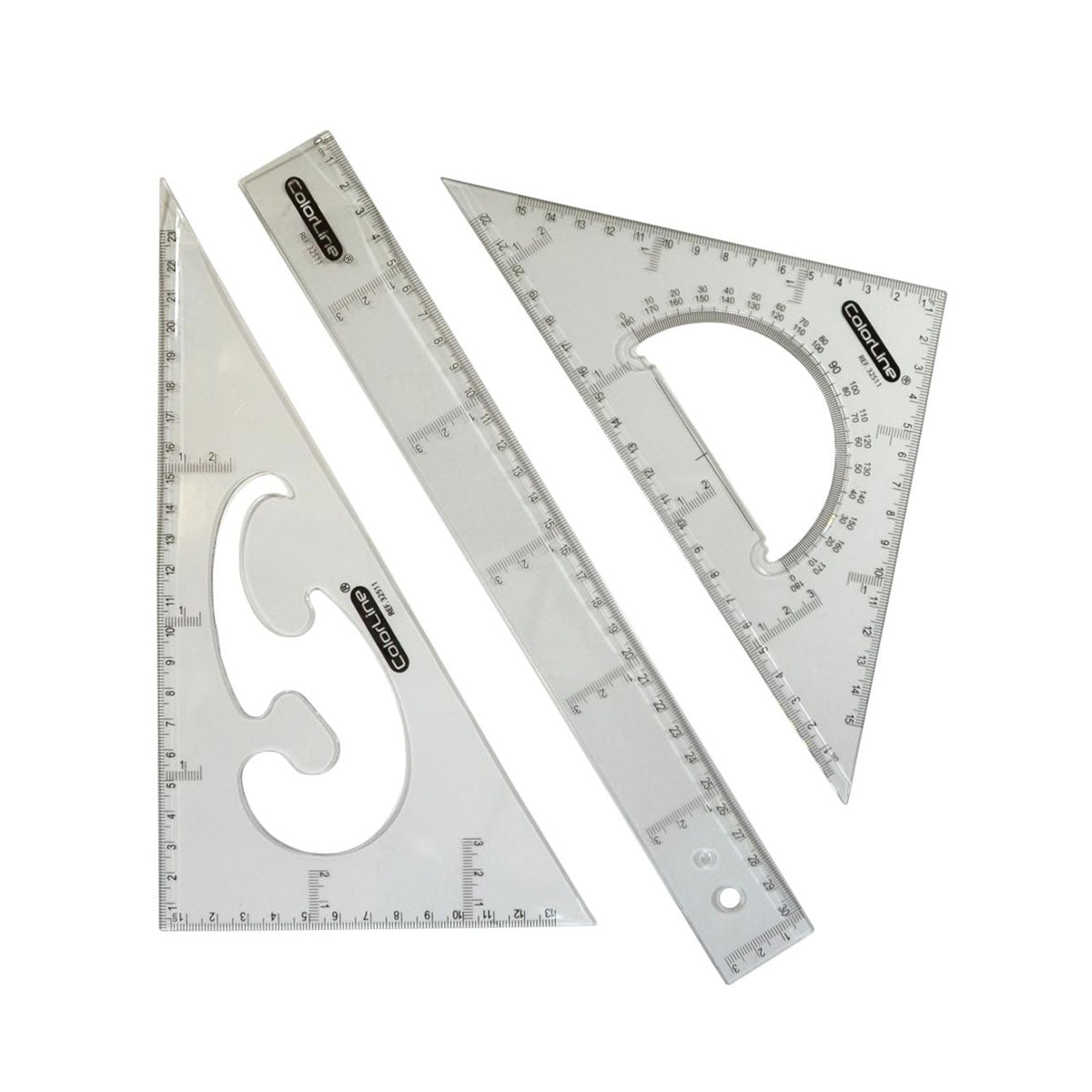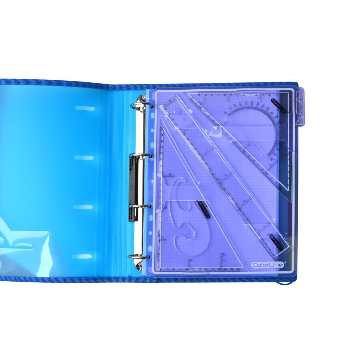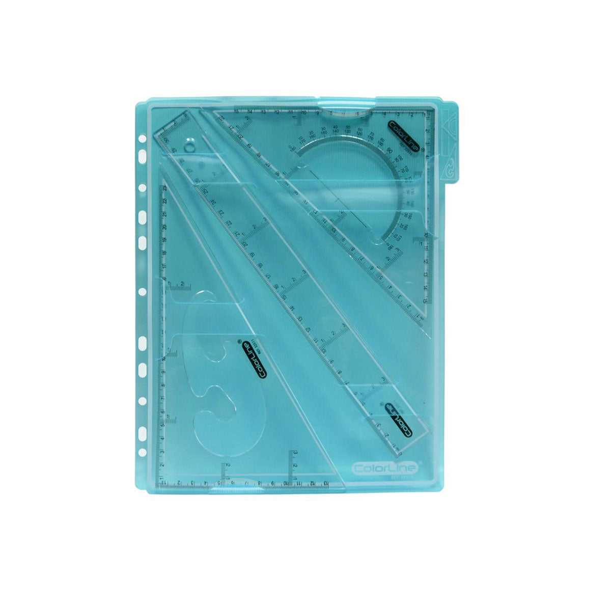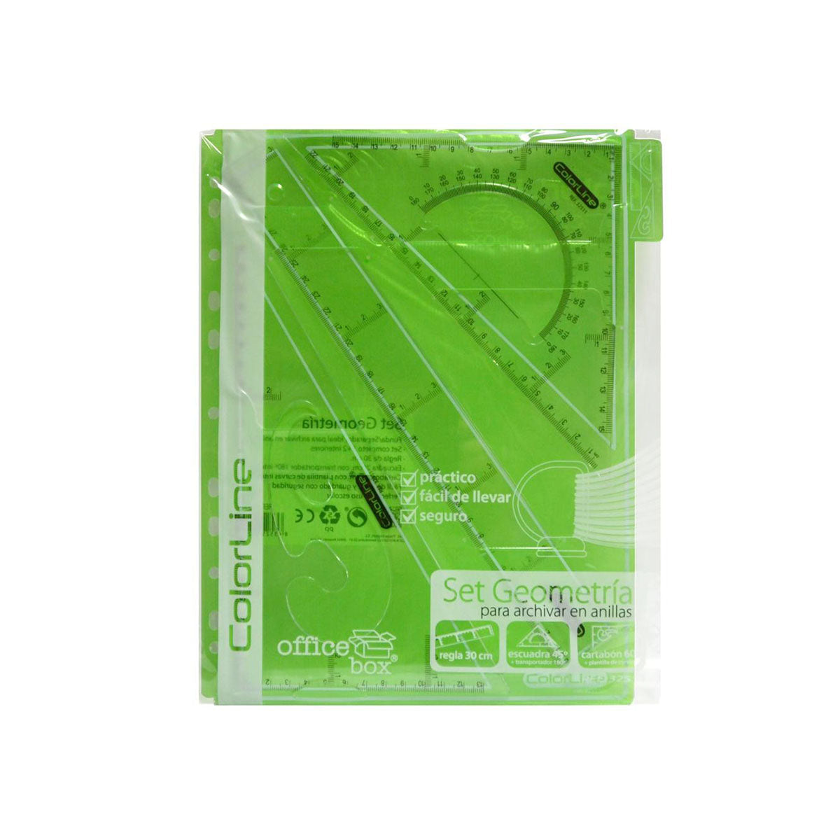 Conjunto para dibujo técnico Office Box que contiene una regla de 30 cm, una escuadra de 25 cm con transportador 180º interior y un cartabón de 26 cm con plantilla de curvas interior, presentado en una bolsa de plástico translúcida con anillas para que puedas llevarlo en tu archivador siempre.