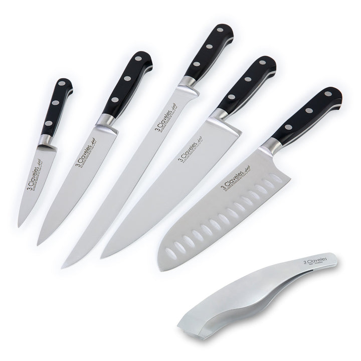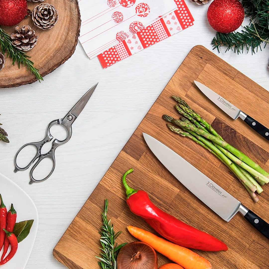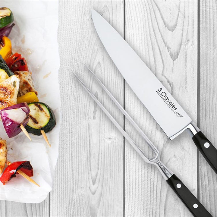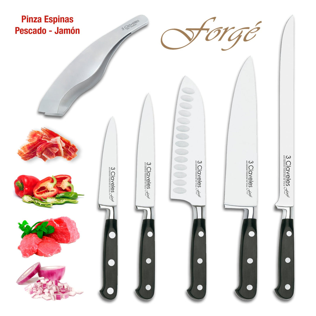Cuchillos gama Forgé para Chef, de hoja ancha, filo liso, estable y fuerte. Es la herramienta multiusos de los profesionales y cocineros aficionados que buscan una alta calidad y durabilidad y que limpia, corta y pica todo tipo de carnes, vegetales, aves y pescados.Fabricados en Acero Inoxidable Molibdeno Vanadio, con un filo duradero y un corte preciso. Mayor confort y seguridad gracias a un balance perfecto entre la hoja y el mango ergonómico, incrementando la productividad y evitando la sobrecarga en las articulaciones. Acero con alto contenido en carbono de alta dureza y mango ergonómico POM que proporciona una mejor adherencia a la mano.