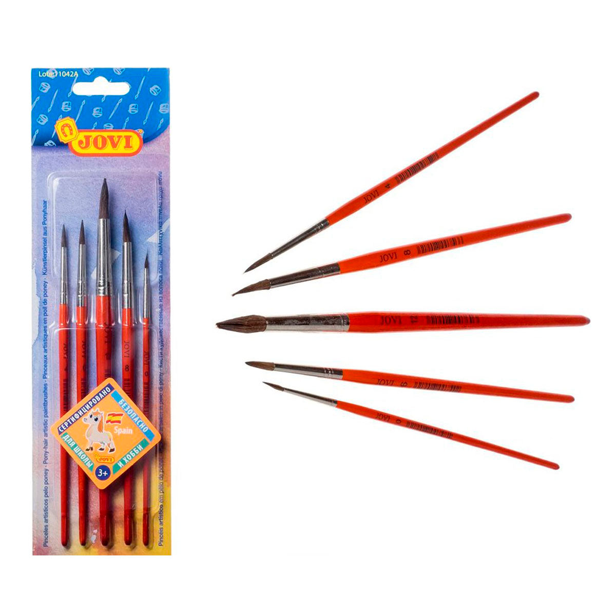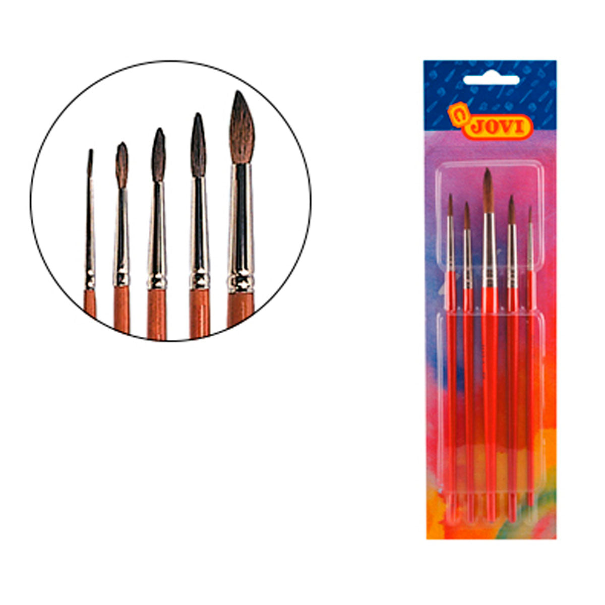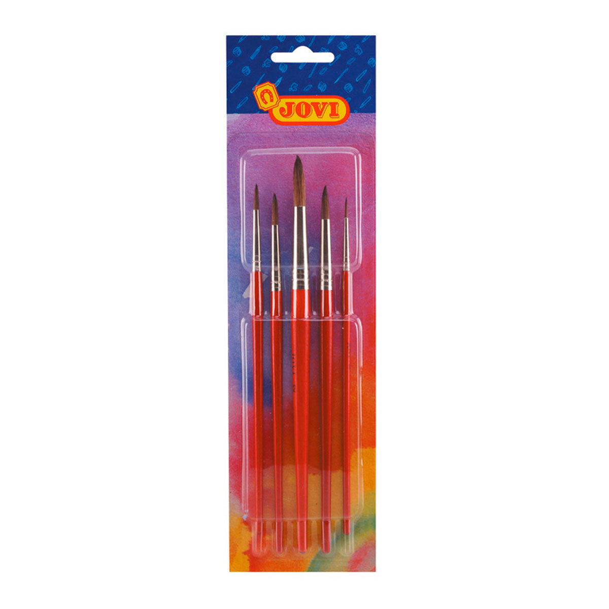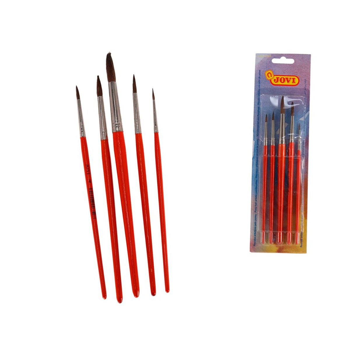 Blíster con 5 pinceles escolares fabricados con pelo natural de pony. Mango de madera con el extremo redondeado, en color naranja. Están diseñados especialmente para pintar acuarela, pero se pueden utilizar para todo tipo de pintura.