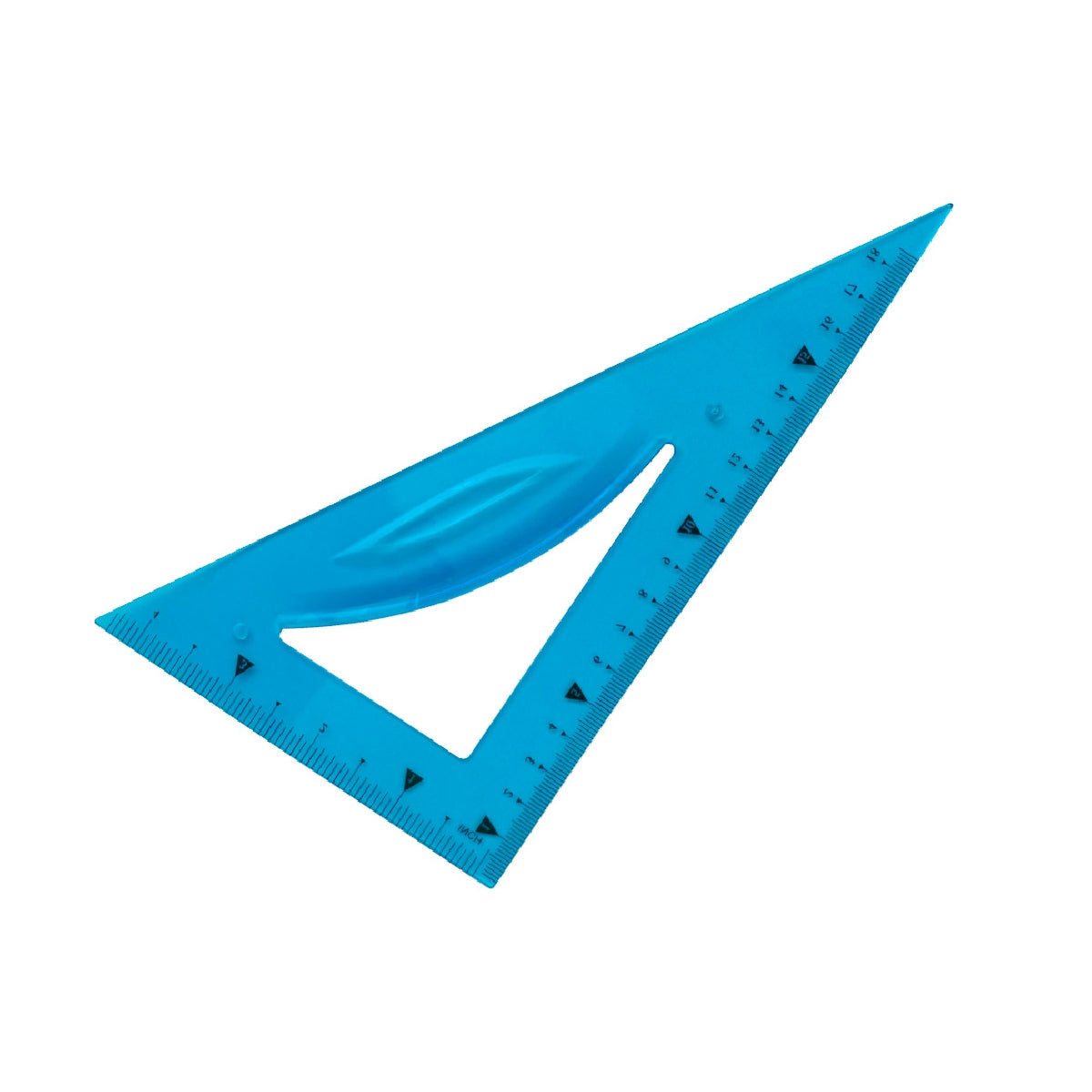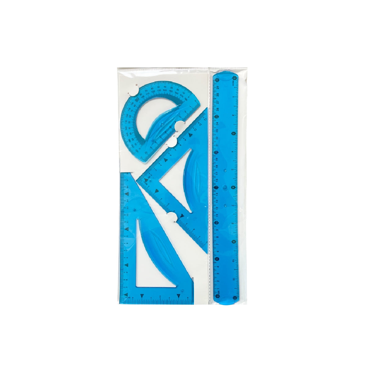 Petaca transparente con regla de 30 cm. escuadra de 10 cm. cartabón de 14 cm y semicírculo de 11 cm (180º). Transparentes. biseladas y graduadas en milímetros. Fabricadas en plástico flexible. No se parten. Colores surtidos: azul. rosa y verde.