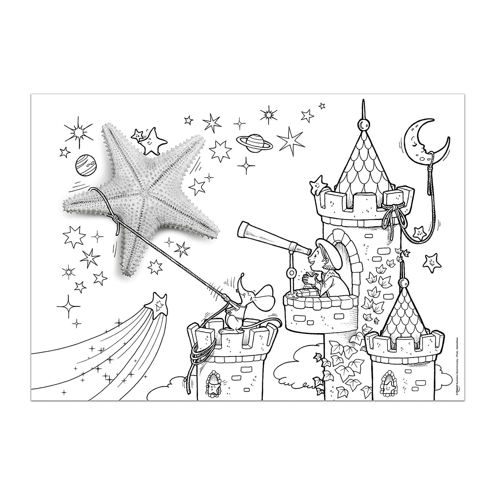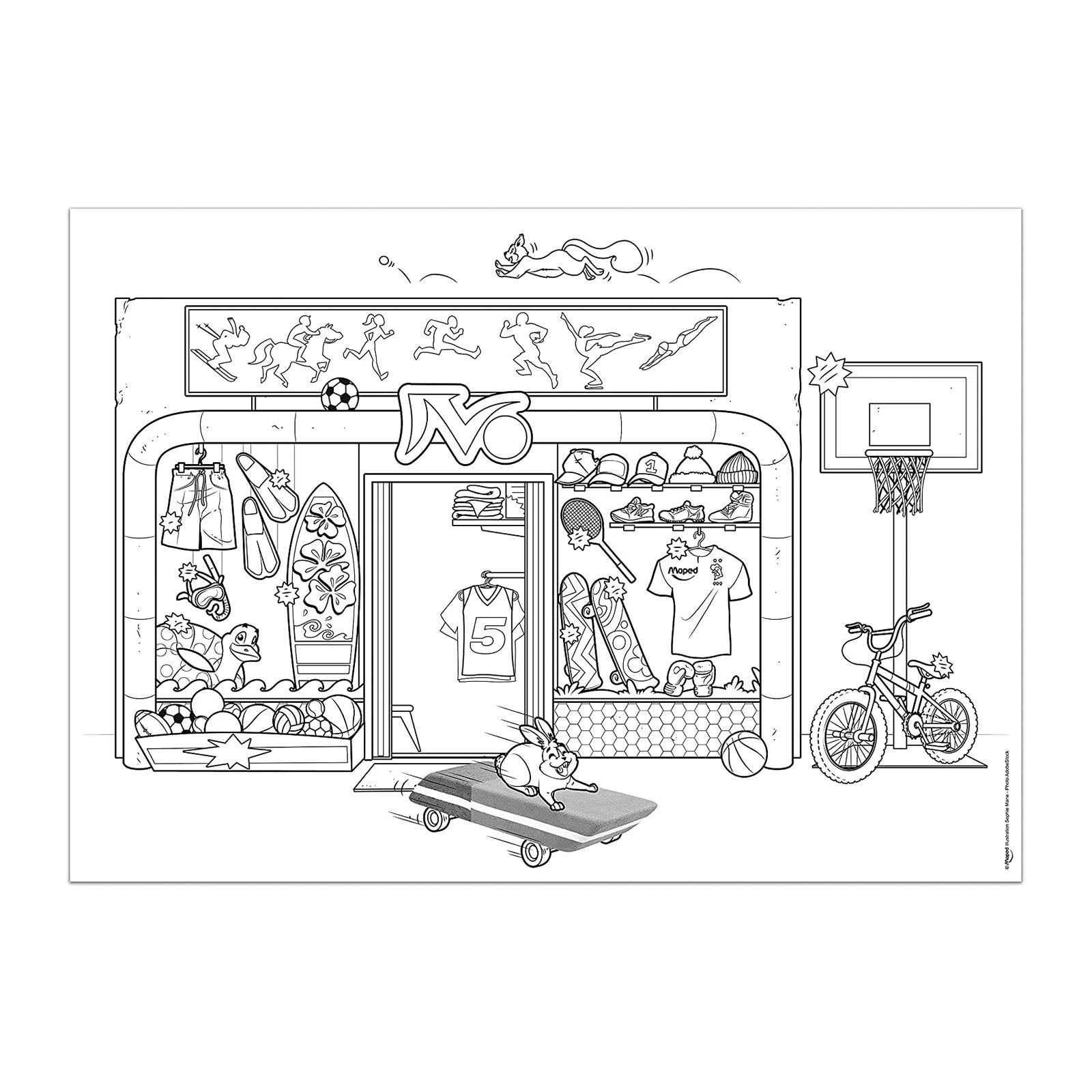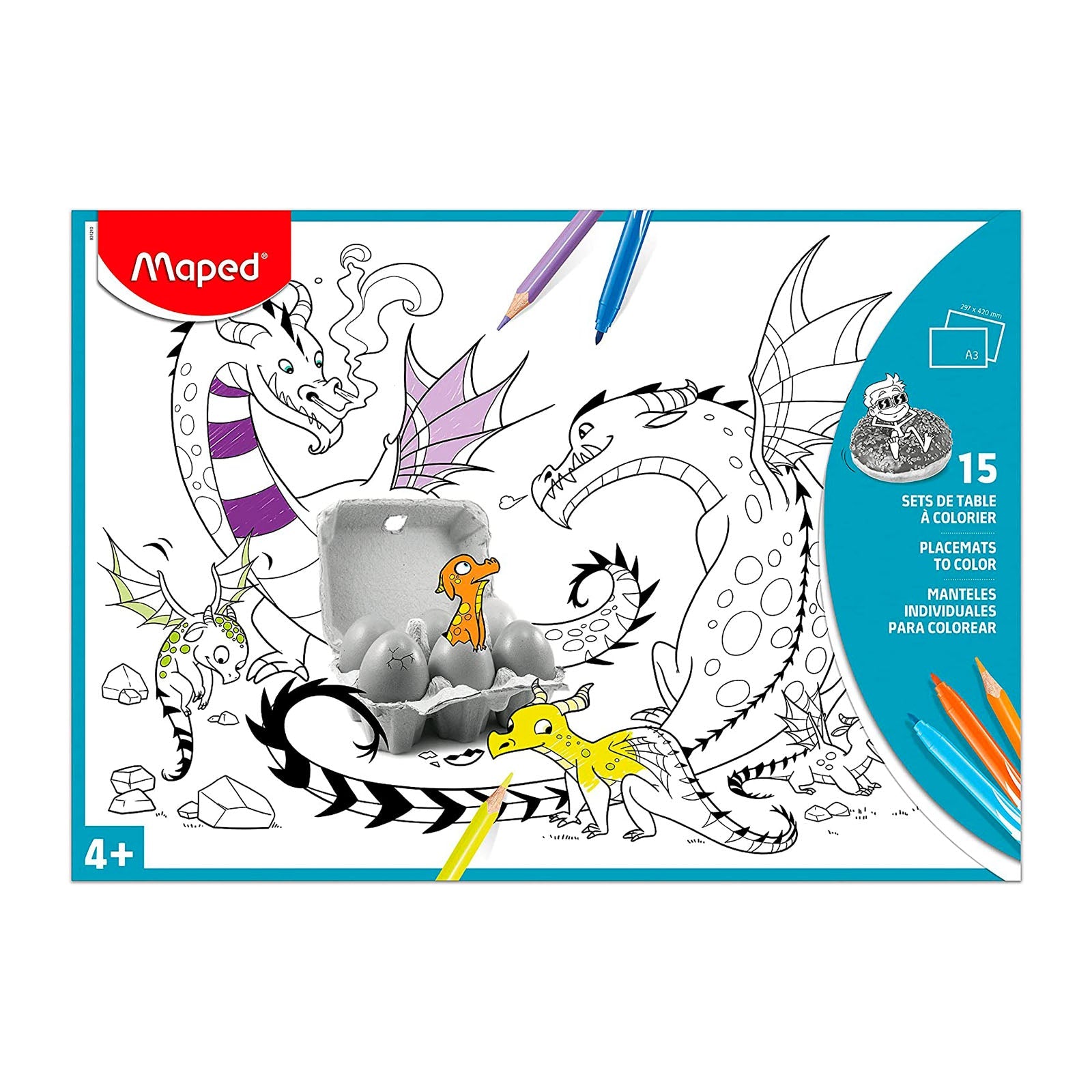 Set de 15 manteles individuales para colorear MAPED perfectos para llevar siempre contigo y permitir a los más pequeños que dejen volar su imaginación en cualquier lugar. Cada ficha tiene una ilustración distinta.