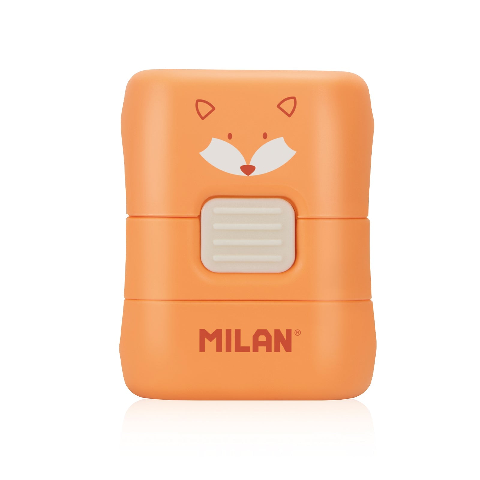 Caja Expositora de combinación de goma de borrar y cepillo MILAN, diseño Compact de la serie Fun Animals. El cepillo es flexible y permite limpiar las virutas tras el borrado.