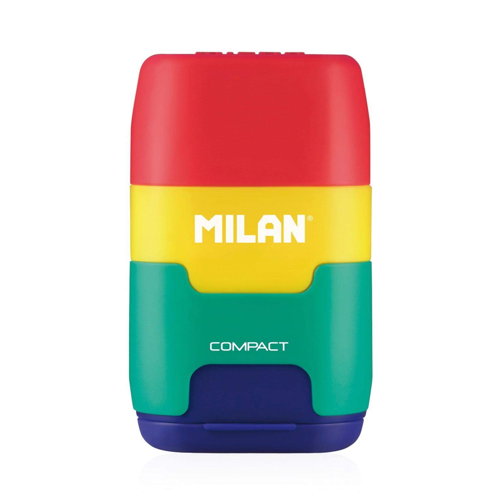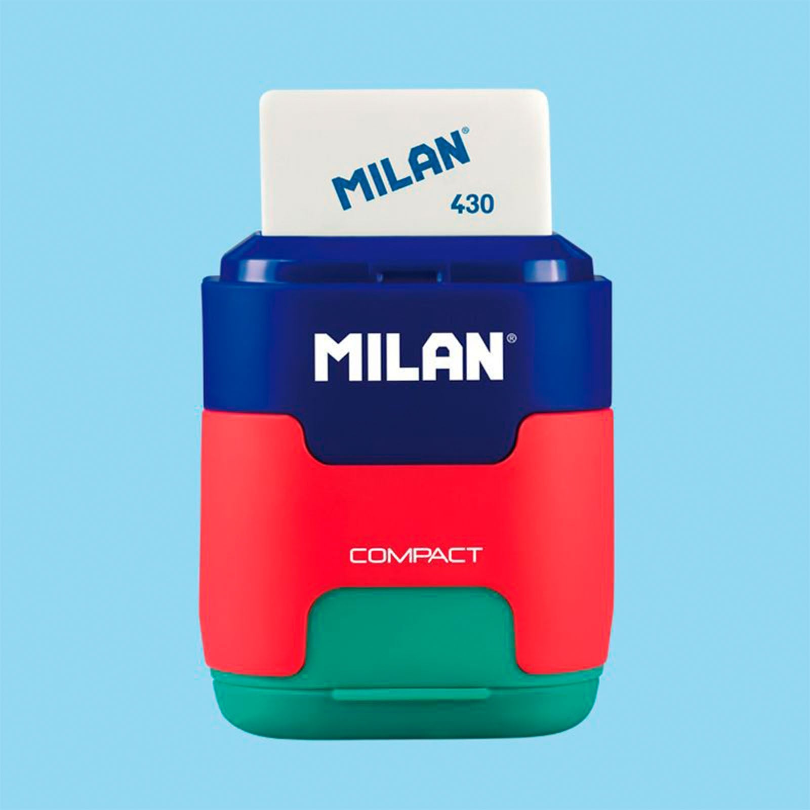 Afilaborra MILAN COMPACT serie Mix, una combinación de goma de borrar y sacapuntas doble (uno estándar y otro MAXI) con depósito. La goma cuadrada es suave de caucho sintético tipo 'miga de pan' y el sacapuntas dispone de una cuchilla de acero afilada y resistente, ideal para todo tipo de lápices.