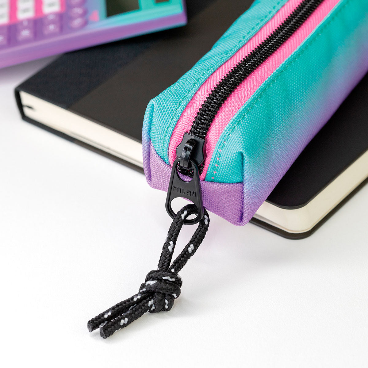 Estuche portatodo mini multiusos de la serie Sunset de MILAN, en una combinación de colores degradados inspirados en el atardecer turquesas y morados, acompañados de detalles en blanco y negro.