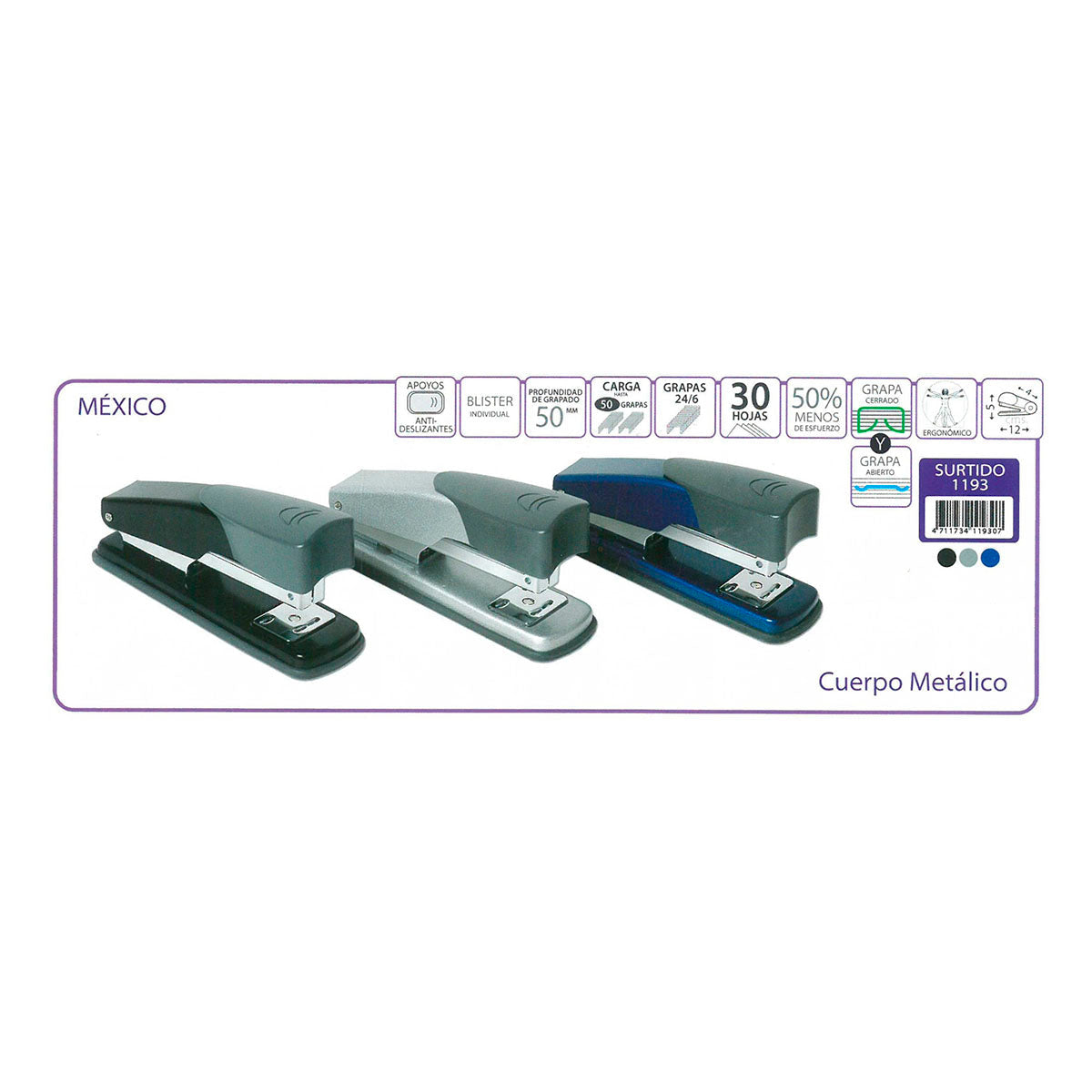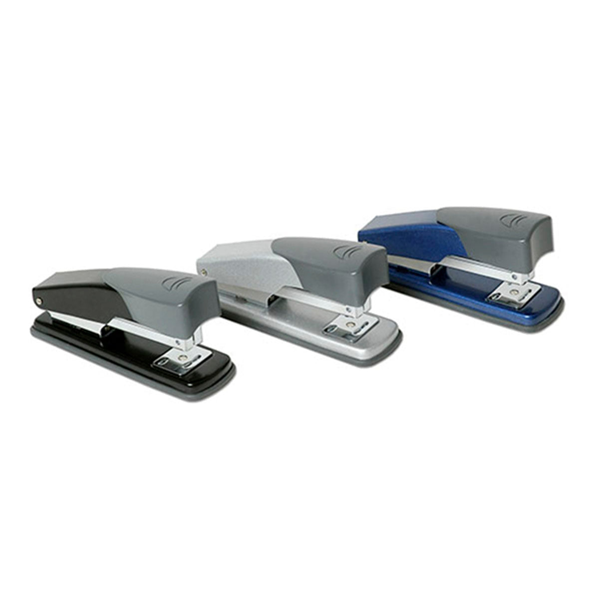 Grapadora de carga superior de metal con apoyos recubiertos de caucho anti-deslizante con carga de hasta 50 grapas. Disponible en 3 Colores. Referencia: 1193