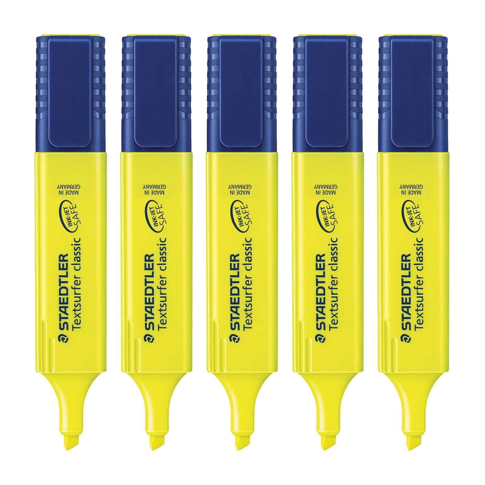 Set de 5 marcadores fluorescentes STAEDTLER Textsurfer® 364 , con gran depósito de tinta para resultados de resaltado de máxima duración. Ideal para marcar texto y colorear grandes áreas. Tinta a base de agua y de secado rápido. Para papel, fax y fotocopias.